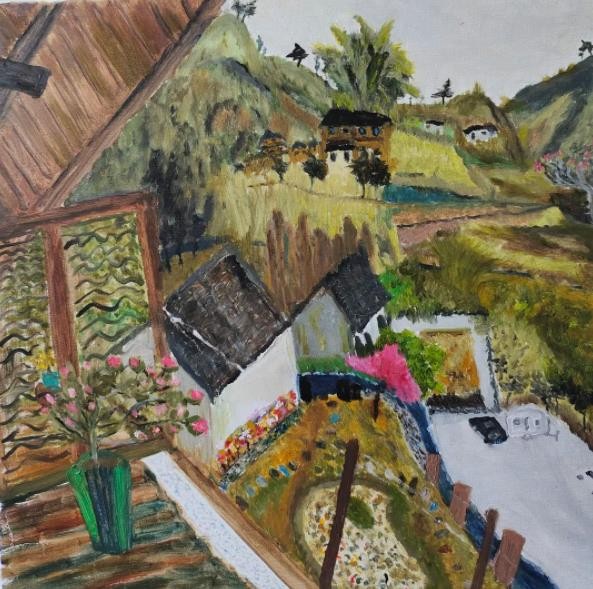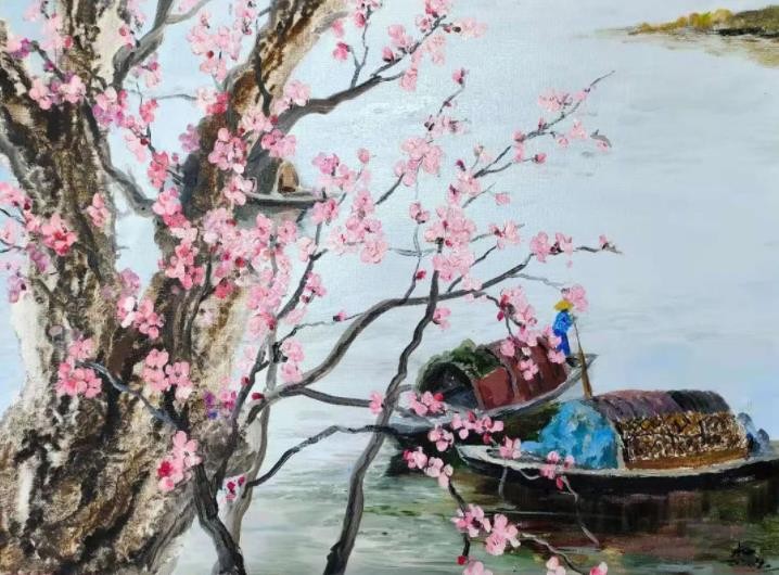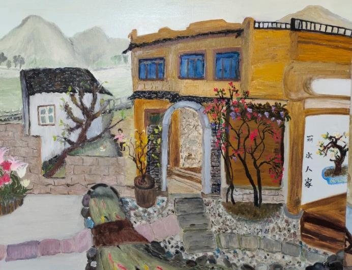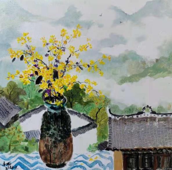 一条老街,缓缓地延伸,两边的房屋,古朴错落地,远处近处有一些人物,那是悠闲的游客,从身影和姿态可以看出步调。一处墙角,斑驳陆离,几束春花,插在陶罐里,一只旧竹篮扣在转折处,一块木板,上面书写着几行诗句散言,...这些可以读出来即形象化的美好事物,都在木西老师这组最新的古堰画乡系列作品中。