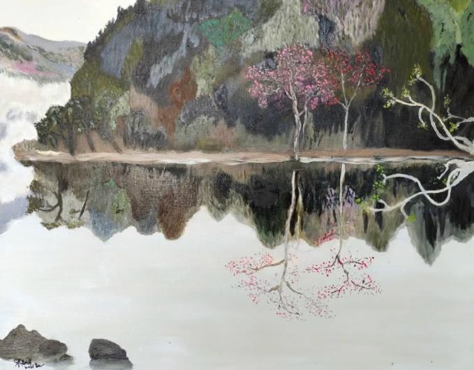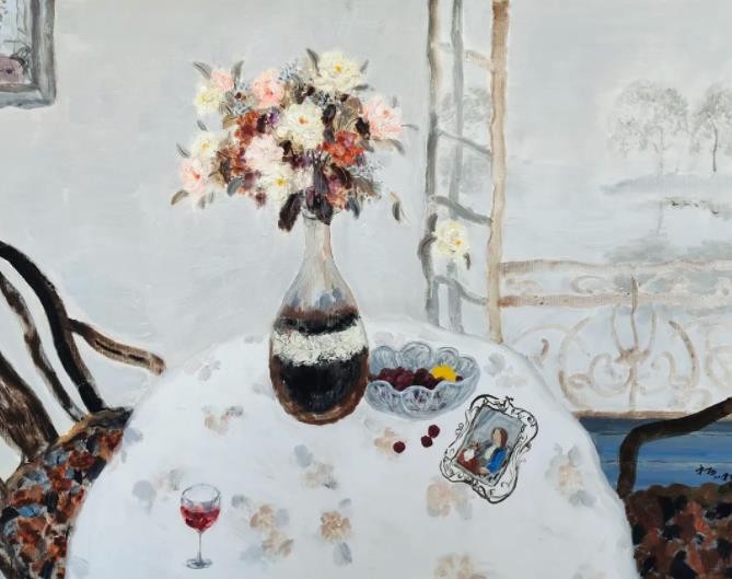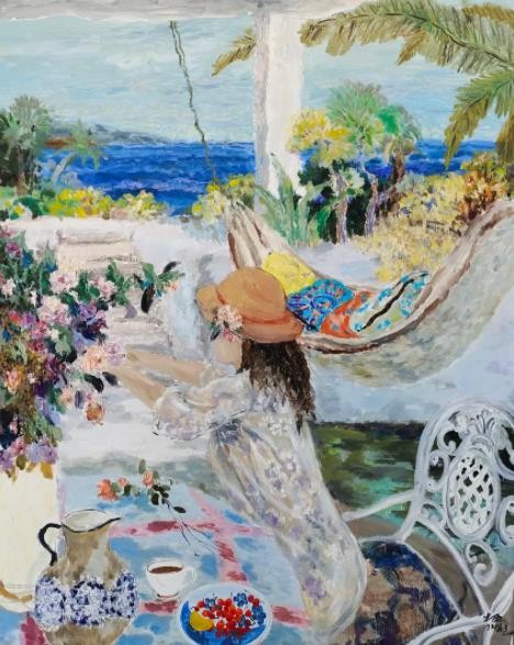 木西老师的作品真是如前面这段言语描述的这般简单么,其实不是的,回到绘画的角度细细品读画面,我们需要捕捉她那来自西方的油彩语言和属于东方的五色气韵意境,是如何被完美地柔和到了统一的画面中,乃至于我们如果只是不经意一瞥的话,会觉察出她画中很多造型都很意象,书写性的笔意灵动飘逸;同样在她的用色上也很符合中国人的审美智慧,柔和的色彩在调性和墨韵之间摇摆,好多局部的造型透视都吸收了中国传统绘画中的散点透视,会让人为之视警觉,会有这种警觉正是我们有基于中西两种绘画系统的对标。所以,我们必须要认清一个事实,那就是,木西老师显然没有按照西方的油画语言标准来绘画,看似柔软的画面其实充满着一种对于西方传统绘画系统的对抗,但她的这种对抗并不是尖锐的对抗,恰恰相反,而是基于对生活柔和的敬畏感,这种敬畏感在哪里,就在当我们走近画面细心品味的时候,那些细小的笔触,细腻的色彩,巧妙的呼应,平铺的转折,微弱的明暗......无所不在,木西老师作品的整体性在我们远观中会呈现出一种整体的“中国式的诗意柔美”,能给予观众一次次的视觉享受,而一旦近观的时候,那种精微之处的控制,又能让人为之惊叹,“这种视觉享受”变成了“抚触”,让人柔软安慰。我想这或许正是木西为了“精准抵达”真实的诗意而有意做出的一种选择,视觉的真实让位于绘画的真实,绘画的精准让位于感受的精准!