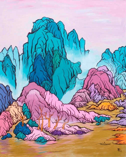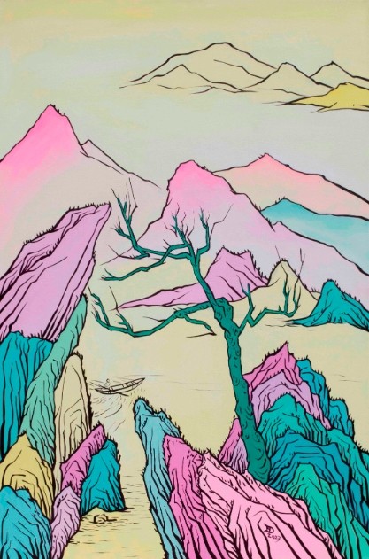 波普对话山水,最后走到一起 ——读邓辉的“波普山水” 文/荣剑 山水绘画是中国的国粹,波普绘画是美国的国粹,山水绘画是前现代艺术,波普绘画是后现代艺术。两种不同的艺术形态,穿越时代和国度的历史屏障,在邓辉的画面上走到了一起,形成一个看似风马牛不相及的独特视觉效果——“波普山水”的美学意义。这是一个双重或双向的解构与重构的过程,一方面是把波普绘画固有的色彩表达挪用于中国艺术语境,通过彻底消解传统笔墨趣味而重构了一种艳俗的山水绘画;另一方面又用中国特有的山水造型置换了波普艺术惯用的物品符号,诸如安迪·沃霍的那些罐头,在后现代特意营造的广告美学世界中植入新的艺术形象。这是一次大胆的艺术探索,体现了年轻艺术家的勇气与才华。 重新回到色彩,回到平面,回到时尚,已成为新世纪的艺术主流,因为新世纪生长的一代,他们开眼看世界的第一印象,就是一个色彩斑斓的广告世界。他们的审美体验不是在历史的黑洞中形成,因此没有如他们父辈所承载的沉重记忆,也不需要进行深度的历史追问,他们只需要关切个人的感受。卡通化的绘画模式之所以在年轻艺术家中广泛流行,就在于这种平面化的色彩表达和简单明了的造型,最符合他们单纯的精神世界。但是,邓辉的“波普山水”并没有在新世纪的艺术主流中随波逐浪,而是承接着波普绘画和山水绘画两大传统,构建了前现代艺术和后现代艺术的一次对话,在时空的超越与融合中,形成了个人鲜明的艺术风格。 安迪·沃霍说过:人们总说时间可以改变很多事情,但事实上必须由你自己做出那些改变。学习和模仿前人,跟随时代主流,是重要的;更重要的是,必须由你做出改变。本次展览是邓辉对波普绘画和山水绘画的一次“改变”。