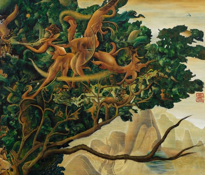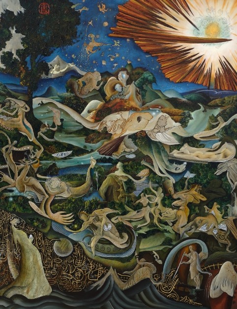 这一转向源于NISKY与两件历史杰作的邂逅:唐代青绿山水画《明皇幸蜀图》与贝诺佐·戈佐利(Benozzo Gozzoli)的《三王来朝》(1459-60)。通过将中国卷轴画的气韵技法与文艺复兴壁画的透视严谨性相结合,NISKY创造出在写实与抽象之间摇摆的构图,将文化叙事无缝融合为一种独特的视觉语言。展览中的作品,如《夕音》与《仲夏梦宠儿》,展现了NISKY对理想化风景的愿景——一种艺术乌托邦,其中人体与自然元素在流动的和谐中融为一体。在《我们的祖先:家族史》中,交织的人物象征着人类演化的连续性;而《纪末星》则描绘了一个古代文明与现代科技在交织历史中共存的未来。