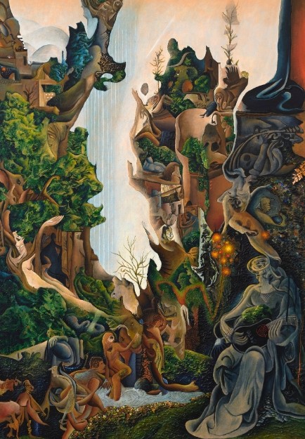 NISKY的创作手法凸显了他对颜料颗粒感与粘稠质感的兴趣,他让颜料自身揭示其想要呈现的形态,而非从预设的概念出发。他用胶带在画布上勾勒出不规则的区域,并以绿色与棕色的颜料重叠填充这些小区域。随后,他将布料按压在湿颜料上,用指甲或小型工具在表面刮擦。当他撕开布料时,意外的纹理随之浮现,隐约呈现出人物与树枝的形态,他再以刻意的笔触加以强化。因此,颜料的物质性引导他完成了最终的图像。这种方法让人联想到马克斯·恩斯特的擦、刮与移印技法,在其作品《雨后欧洲II》中,马克斯通过刮擦或按压颜料创造出繁茂的风景,并以这些奇异图案作为视觉表达的基础。在《超越绘画》中,马克斯引用达·芬奇的观点,认为艺术家应从污渍中发现风景。艺术天才与随机中发现意义的联系,根植于文艺复兴时期,并由超现实主义者强化,而NISKY则将这一理念推向更远。正如他所言:“艺术如同解谜。我试图从颜料的无序状态中挖掘答案,推理真相。”