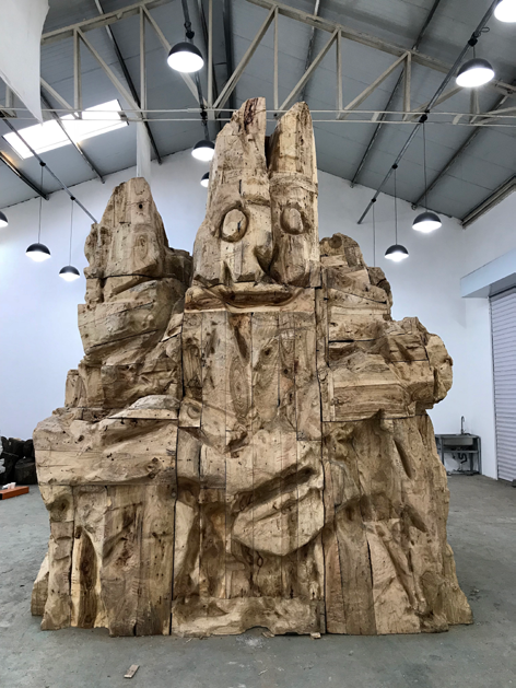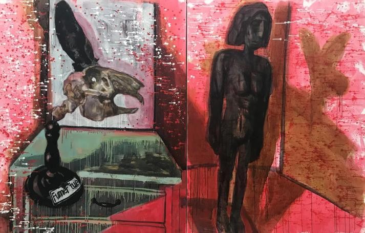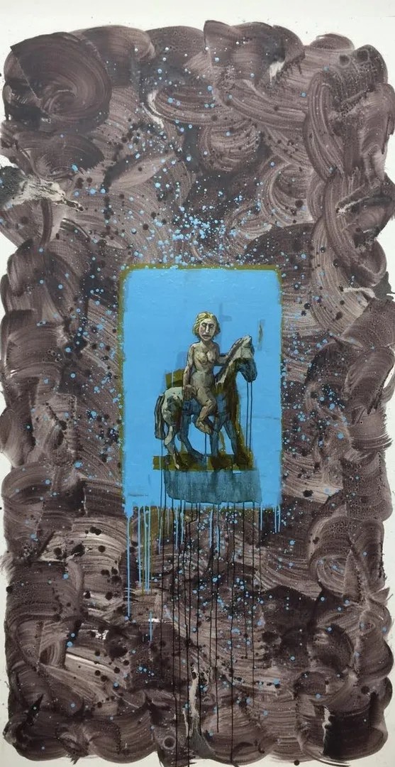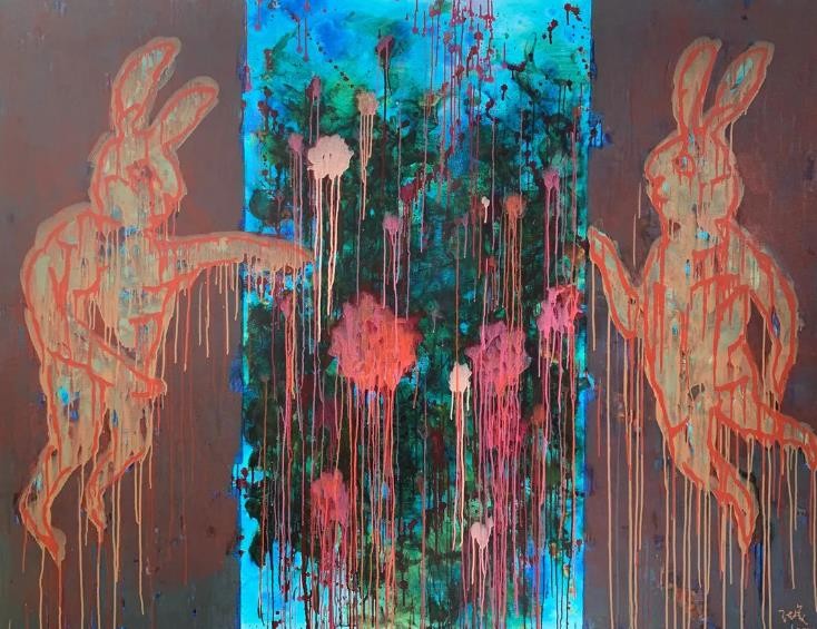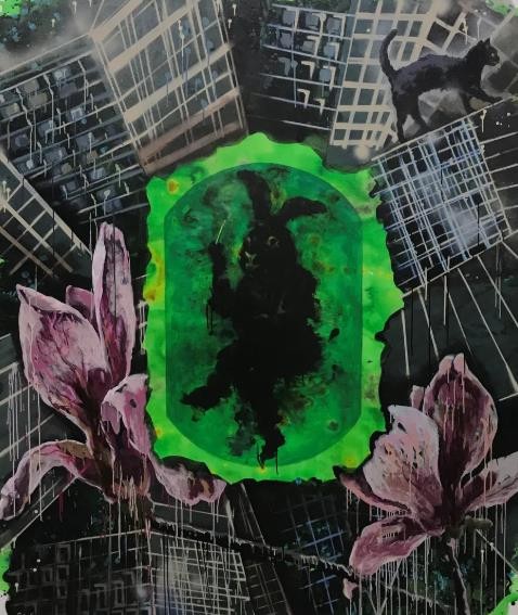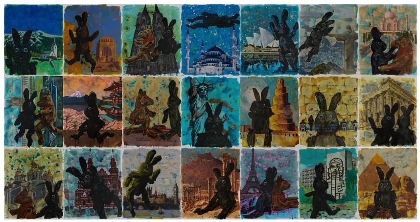 转而进入新世纪,陈曦正当经验丰富、年富力强,豪勇之气依然劲健,她再次征程,由《历史记忆》走向世界蓝图。她如昆仑剑客、雪山飞狐,松弛有道,剑走偏锋。她峰顶观望,越出昆仑山、东海,要对彼方的世界一探究竟。她以兔子为意象、象征挥洒起来,创作了一系列世界图景,它们杂糅了现实与历史、艺术与想象、此岸与彼岸的画面。而这些图景中的兔子可以是知识的符码,也可以是知识的对象,甚或是未知的象征,向世界的图景构建者提出构建之问。以此,陈曦突破画框限制,大刀阔斧地创作了一件巨型的兔子造像,非常神似,不雕琢,但表现力极强。它与陈曦的系列绘画构成互为的整体,彼此证实着艺术的力量,促人驻足静观,暂时放下纷争,以静穆的深思仰望这些作品。艺术是什么?是拉近彼此交流的一种语言方式。陈曦的作品做到了。