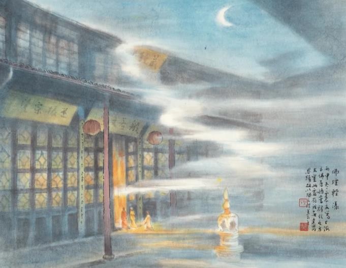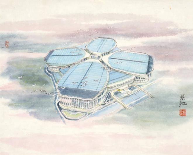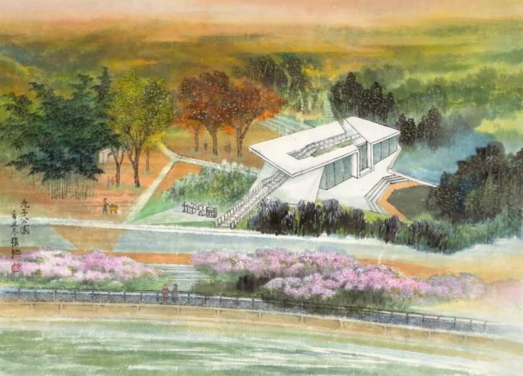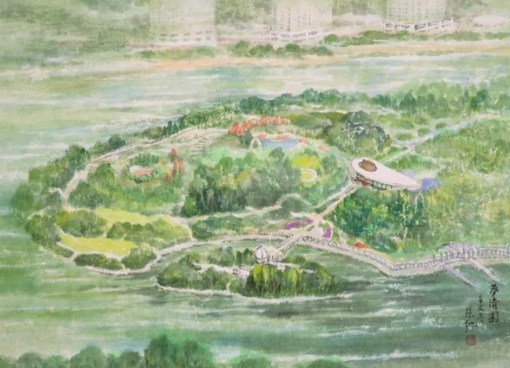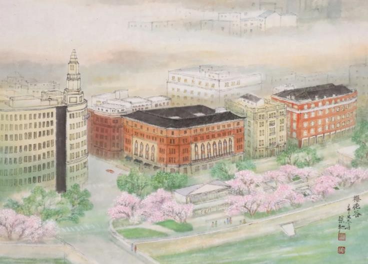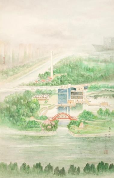 另一组是张弛所创作的《苏州河八景》:《世界会客厅》《樱花谷》《华东政法大学》《蝴蝶湾》《邮政大楼》《梦清园》《九子公园》《洛克篮球公园》,呈现了苏州河两岸的新旧标志性景观,将苏州河的历史文脉与当下胜景贯通,让观众对于未来产生了更多的憧憬。张弛曾经花费10年心血绘制广受好评的《海上揽胜·七十长卷》并入藏上海市历史博物馆,描绘了包括黄浦江、苏州河两岸在内的上海128处代表性景观,为城市留影,替历史存档。张弛的《苏州河八景》可以说是《海上揽胜·七十长卷》精彩的延伸。这些作品和乐震文的部分相关作品都曾多次在苏州河光影秀上亮相,借助现代化的媒介传播到了更大的范围。