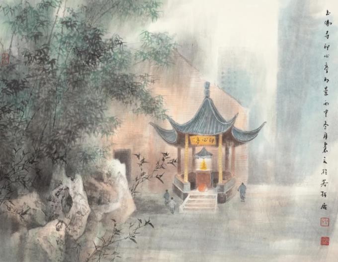 除苏州河题材,本次展览还有其他不少可圈可点之作。我尤其喜欢乐震文上世纪90年代末创作的《窗》《窗内》两幅水墨。乐震文巧妙地通过画面肌理、光影的别开生面的处理,传递了微妙的情绪变化,处处可见神来之笔,富于诗意,令观者回味无穷,浮想联翩。而他的《浦东新貌》《南浦大桥》《华师大校园》《百年愚园路》《愚园路上的秋叶子》《中共一大会址》《外滩》《玉佛寺》小景(4幅系列)和张弛的《海上揽胜·七十长卷》之《浦江之首》《陆家嘴》以及《静安嘉里中心》《东海大桥》《国家会展中心》等佳作,更是反映了他们对于上海城市景观风貌题材的不断拓展。