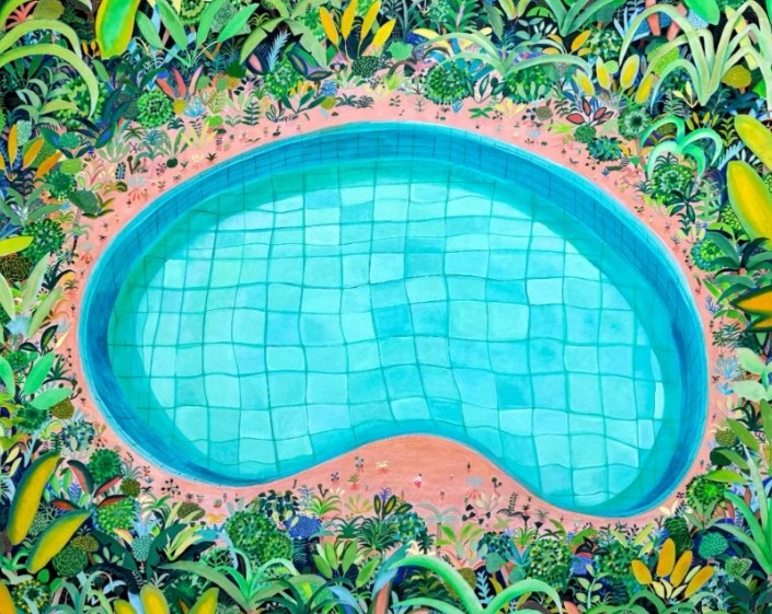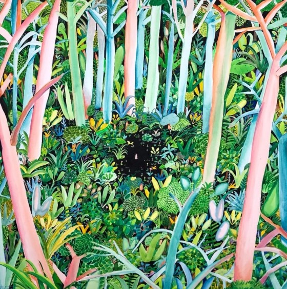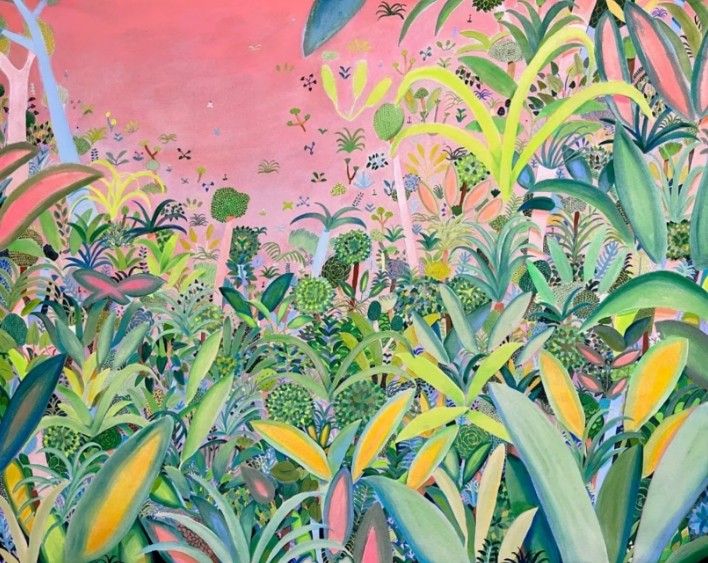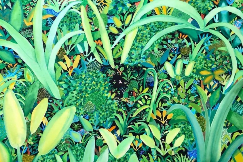 在北林南近些年的创作中,她描绘了大量的热带丛林场景,这源于她在东南亚国家旅居的经历,深入到原始丛林中的探险,目之所及全部是草丛与绿植,使她感受到未被人类所干扰的大自然,充满原始气息的风景、色彩和气息,这些才是她真正想要描绘的世界。