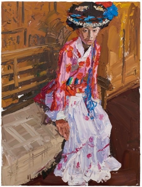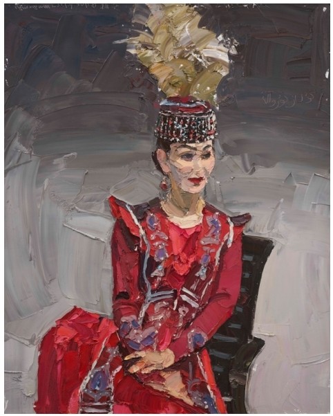实际上,远景有力地释放了画家的远观经验,他努力把这种视觉经验移用于室内的近观凝视之中。在这些室内人物生活的近景中,似乎一时还难于适应近距离凝视的精致细微,这便形成了袁元这些近景人物的简略化造型。他喜爱使用刮刀平抹或大号笔触有力的提按,力图将那些厚实的物象压平,寻找那些简略的形体隐藏的或由他的视觉思维简化的抽象性关系。《敦煌的女儿》就是这种视距变化制造出的造型意味案例,由远及近的视感变化形成了粗简与抽象的平面化造型改变了人们习以为常的观看经验。