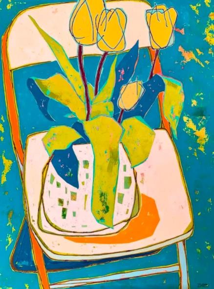 另一幅是她在夜晚散步时遇见的那种造型普通、被随手扔在街边的椅子,依靠的墙壁上,路灯为它投下一面阴影,这把被丢弃的椅子在无人的街道上和一个影子窃窃私语,像孤独的人靠自言自语来填满空气的寂寞。