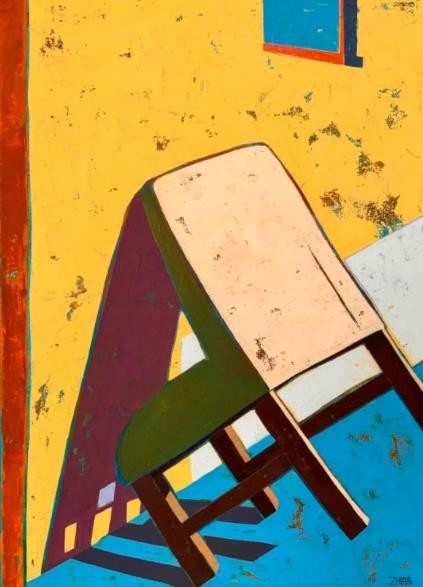 张哲的新作品里有两把椅子是我非常感动的,一幅叫做《艺术家的椅子》,画的是她画室里的一把椅子,一把很像教室里那种造型简单的椅子,那上面本该长出一个艺术家,但此刻艺术家在远处观看着它,这种凝视一如她坐在上面凝视面前的画。通常艺术家工作的时候总是背对着真实世界,面朝一张画布创造一个自己世界,然而这一刻她偏离了轨道,走到自己背后,看着这把椅子,看着椅子上的自己。