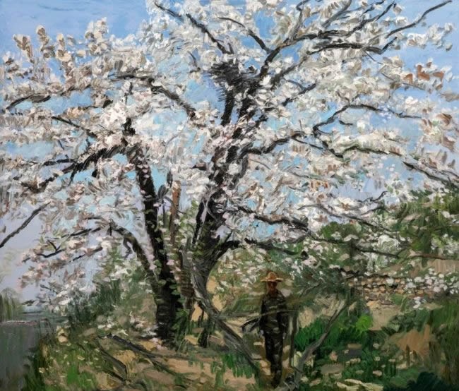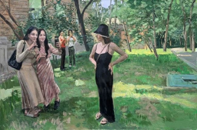 画有地域之风。东北油画在中国油画的格局中有着鲜明的地域特征,那就是表现性油画风格。作为东北表现性油画的代表画家,王建国早年即形成了表现性语言的追求:下笔恣意,充满感性;色彩强烈,诉诸直觉;肌理厚实,富有张力;光影斑驳,意态浑然。这些年,他在表现性语言的基础上进一步拓展,把“表现”和“写意”的结合作为研究课题。如果说“表现”是吸收西方现代绘画语言的话,“写意”则是朝向中国文化传统和东方感受方式的自觉,二者的结合在不少油画同仁那里已成为学术共识,体现出构建“写意油画”的路径。王建国在这方面的追求使他的作品呈现出悄然的新变,在取景布局上更加注重置身“现场”的整体感受,环视四方而取舍组合;在塑造形象时更加注重营造画面意境,下笔明确而气韵贯通。他善于一方面用刮刀厚涂重抹,任色彩在画面互补碰撞,一方面用中国毛笔勾画细节,使线条在空间穿插交织,两种笔法相辅相成,在视觉上形成强烈的张力。相比起前些年的作品,他的作品更具有一气呵成的内在韵律,把无意识的书写和刻画性的造型有机结合起来,形成“写意油画”的一家风格。