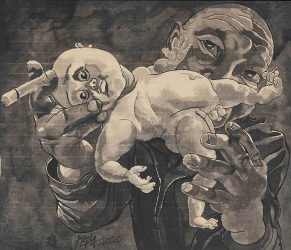 这一阵子为撰写本文,我将方力钧的大量水墨作品仔细看了一遍。感到他的水墨创作大致分为如下三种手法:第一是采用了纯粹的白描手法;第二是在白描的基础上染色;第三则是主要采用了泼墨或没骨的方法,而且是以水与墨为主。另外还有一些作品由于混用了以上各手法,所以很难加以分类。如果硬要加以归纳的话,我们似乎可以说,方力钧在进行水墨创作时,其实无非是在传统水墨中的白描与泼墨的方法之中寻求变化,具体办法就是在其中注入一定的西画元素。这也意味着,方力钧相关水墨手法的创造既要归功于他对特定价值、趣味与想象的追求,亦要归功于特定社会背景和历史背景对视觉形象所提出的全新要求。在这里,有一点必须说明,即我在上面的说法并不是想强调或暗示方力钧所创造的相关水墨手法就比传统水墨与写实水墨的规范要好,而是认为这一套手法更加适合于他,因为其使他能自由地追逐想象的思路,进而找到与心理状态相适应的画面效果。