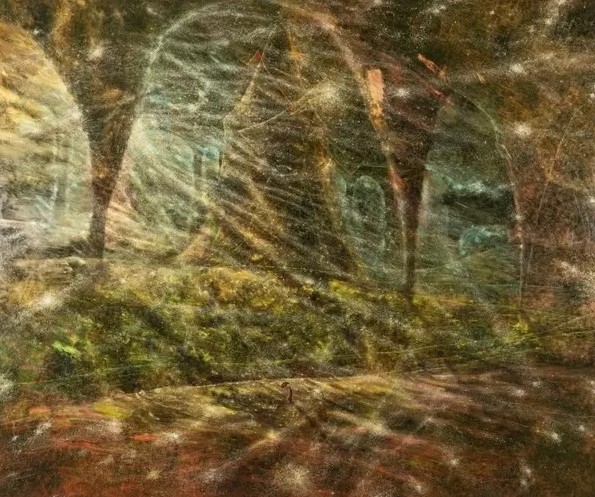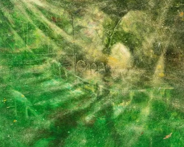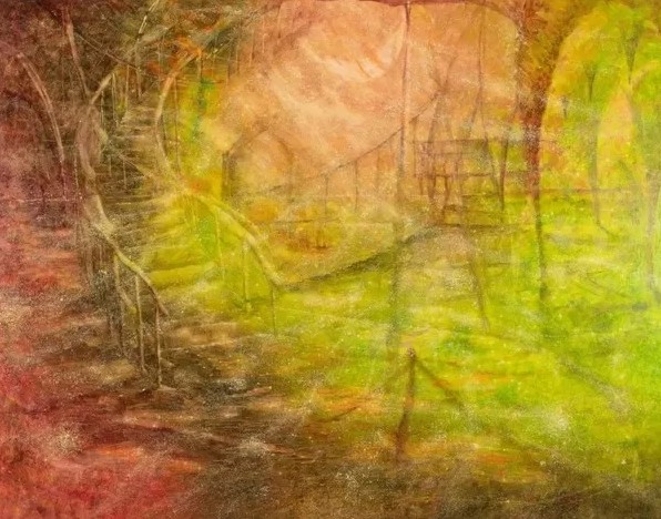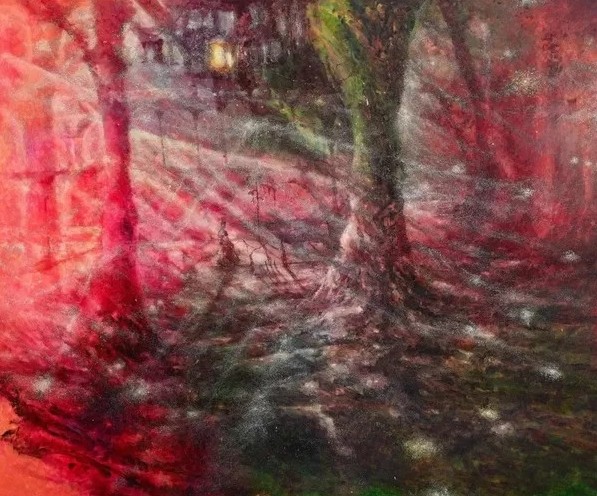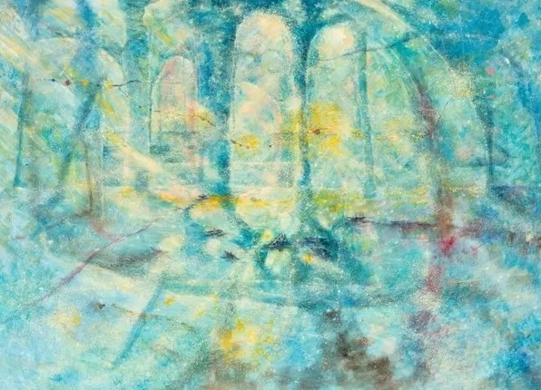 盐泽凯伦是一位新生代艺术家,毕业于东京造型大学研究所并取得了硕士学位。童年时期在荷兰生活多年的经历深刻地反映在她的作品中,呈现出独特的空间透视感和光影的对比。她试图描绘一个通过视觉以外的感官所认识到的世界,开拓透过声音、光线等能对五感产生影响的表现元素。作品的线条及构图融合风车、古典拱门、和教堂尖顶等欧洲建筑元素。她采用了明暗对比的绘画技法,在增强光影对比的同时将鲜艳的色彩融为一体。盐泽凯伦的绘画风格严谨、手法细腻,她先以轻拍画笔的方式涂上美丽的色彩,之后在画面上勾勒出想象中的世界,再用针将颜料慢慢刮掉;经过对细节的不断处理及最后通过敲击画笔的方式进行点缀、增添柔光的效果,作品的完整面貌展现在观众面前,呈现似幻似真的场景。