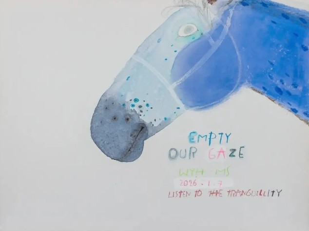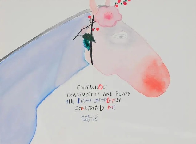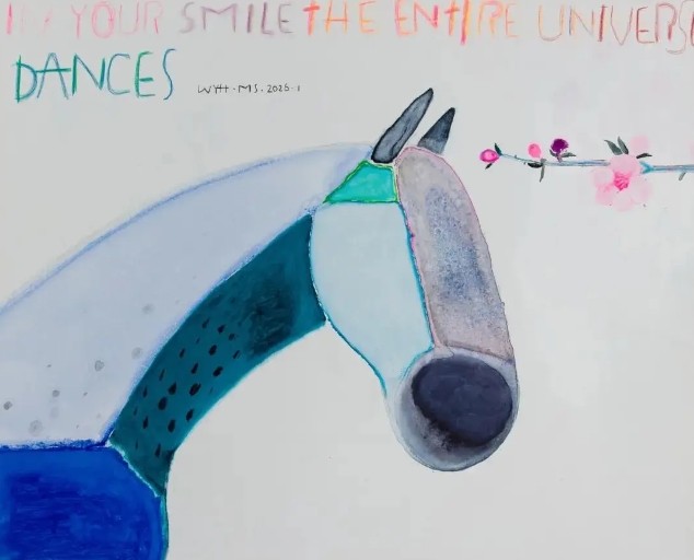 “马上美好”系列,是王玉华作品中色彩最具天空感的。这些马儿看起来温和纯净,精神层面少有的贵气,同时极具代入感,早晨的气息扑面而来。马头上的花枝,似乎还带着清晨的雾气。而英文的涂鸦式语句:“在你的微笑中整个宇宙都在跳舞”“清空你的凝视”“我看到了狂喜的宇宙”,更是传递着艺术家赞美纯然生命的艺术态度。也是对大家的真挚祝福,愿新的一年,我们都能更勇敢地体验生命,感受更多美妙。
