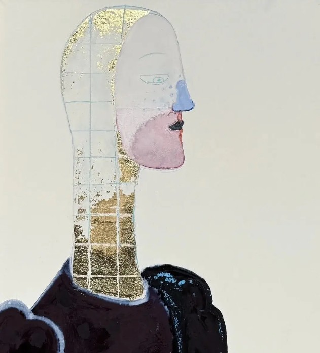 在“神圣的沉默”系列中,王玉华构建了标志性的中性面孔。通常以侧面示人,既带着文艺复兴时期肖像的庄重肃穆,又经过巧妙简化,呈现出抽象的几何形结构,画面有金箔、银箔与矿物颜料等材质,软硬厚薄的相互碰撞,体现着不同情感的博弈与交织;而夸张的泡泡袖廓形,更为画面中的身体赋予了神秘力量。这种复古与当代元素的巧妙交织,自由探索的创作态度,正完美契合“神圣沉默”的深刻理念:“神圣”,代表着至高无上的真诚;“沉默”,象征着无边无际的永恒宁静。在深度冥想的境界中,一切界限都被悄然打开,艺术家踏入内在的神圣空间,敏锐感知生命的循环与流动,并用心记录下意识中刚刚默观的一场场无形戏剧。