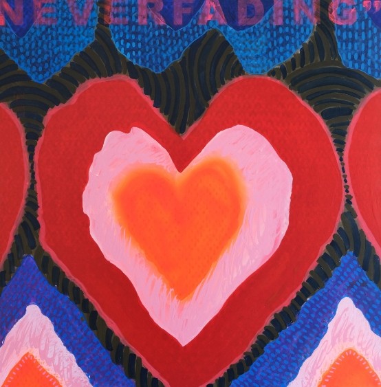 值得一提的是,子竣在全新系列作品中巧妙地融入了图案与英文元素,使得每一幅作品都充满了跨文化、跨语言的对话与共鸣。这些元素不仅丰富了作品的内涵,也展现了艺术家对多元文化的包容与尊重。图案和英文的结合构成了独特的物语,倾诉着艺术家内心深处的情感。这些元素如同隐藏着秘密的钥匙,引领人们探索心灵领域。