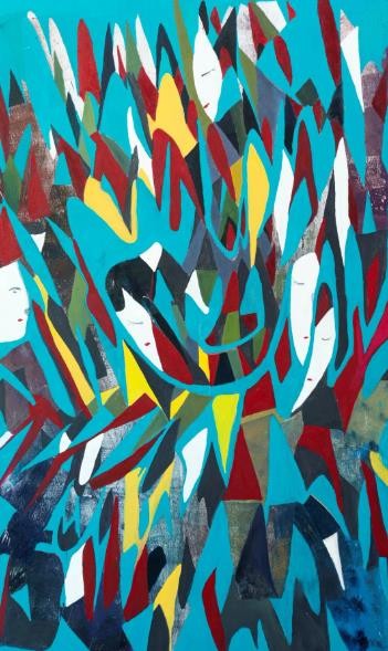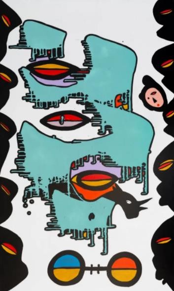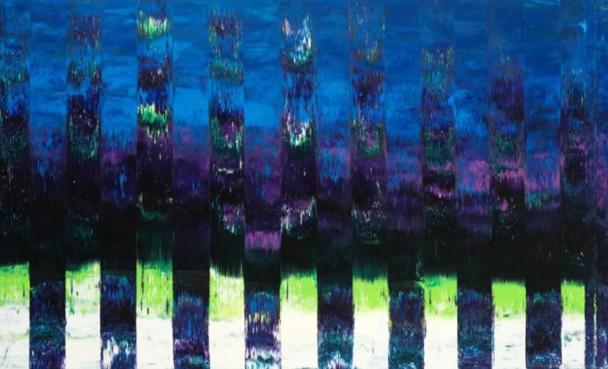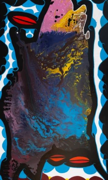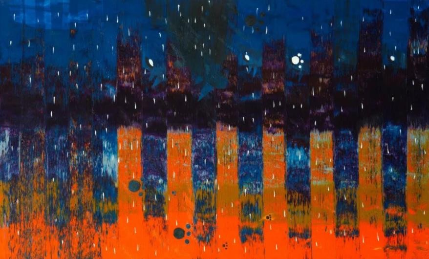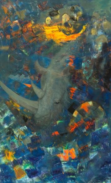 贺鹏飞对家乡内蒙古有着无法割舍的情愫,近年来的创作灵感也大多来自于那里。在一次回乡采风的机缘下,萨拉乌苏文化遗址为他打开了一个神秘世界的大门。于是他化身穿越时空的一粒微尘,就此展开了一场惊心动魄的奇幻色彩之旅。他将那些斑驳的地质风貌、销声匿迹的远古神兽以粗犷、庞大、离奇、荒诞、可疑而又绚烂的表现手法冲击进人们的视觉中,直抵心脉,邀人共赴那场远古人类文明的色彩狂欢。