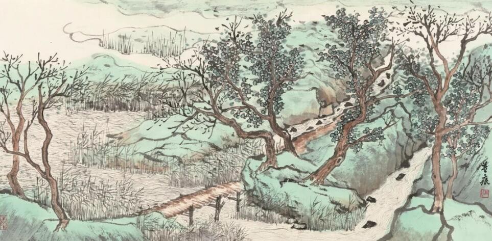 跟随浙江省文联、省美协文化润疆,初识周燕宛如重逢,细聊原来曾在国美就读,过渡期的滨江校园如弹丸之地,大学和附中在一起只有两幢房子,人少,来往擦肩,依稀眼熟。周燕属于江南典型的温文尔雅,画如其人,如山野绿茶,清逸出尘,婉约恬淡之意跃然纸上。