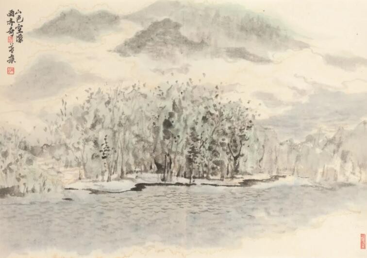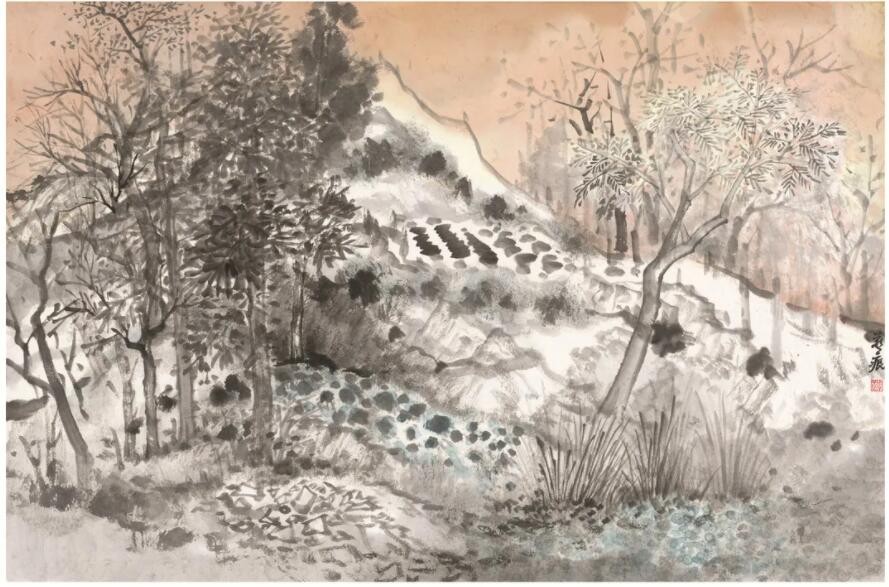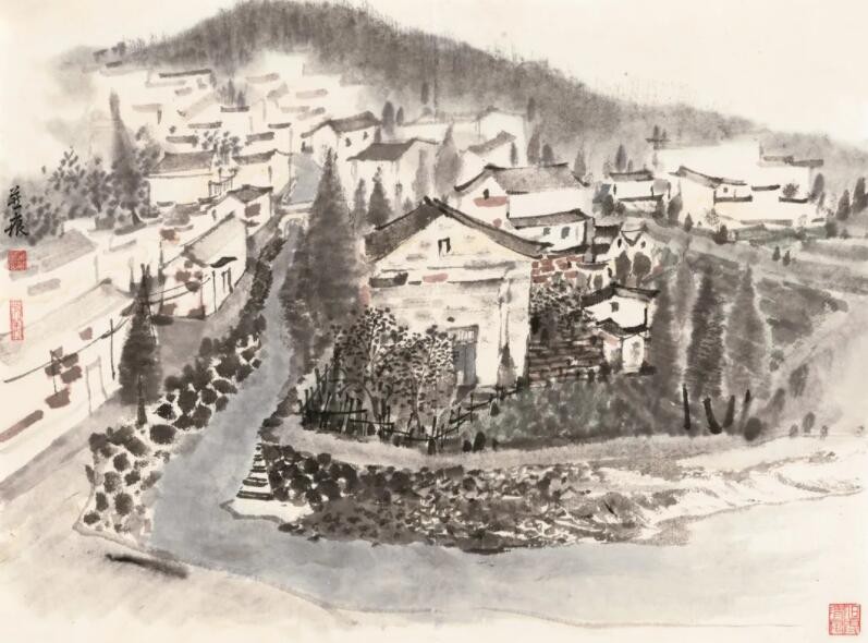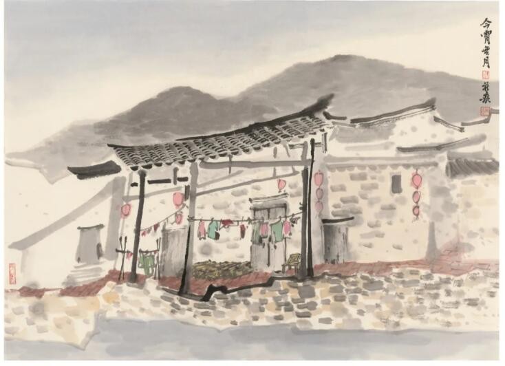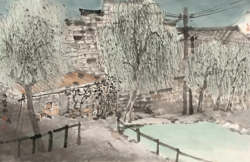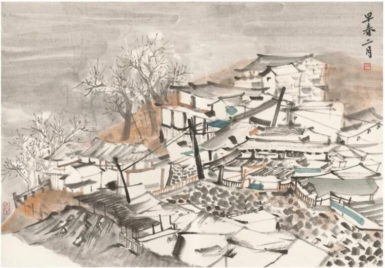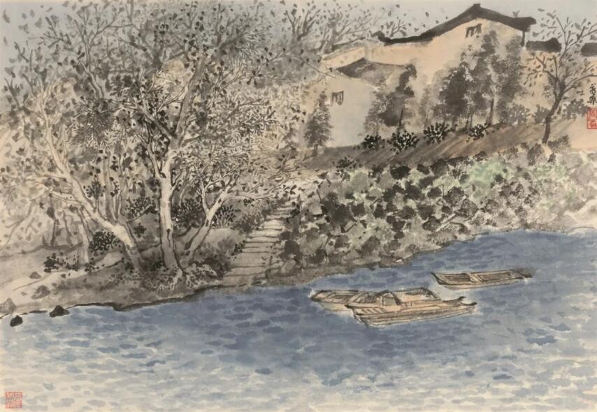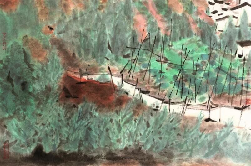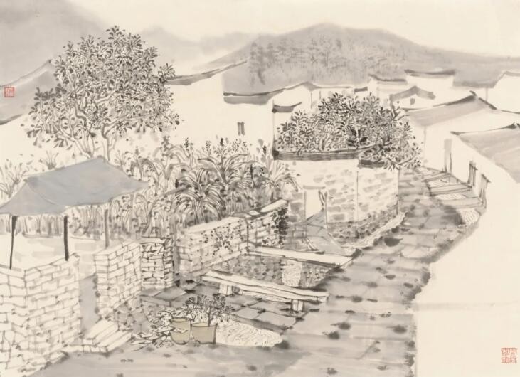 二十多年的专业训练,周燕对水墨的表现力,干湿浓淡、色彩协调、自然意境的把握有着独到的理解和表达,形成了细腻、清雅的画风。她非常注重写生,曾在《写生随想》中写道:“古来画家的创作离不开名山大川的滋养,离不开面对实景的写生……要进入到真山真水中去体验,去感受,去创作。通过对‘物象的生动’表现‘物象的意似’来追求意切情深、理达而隐的画外境界。写生即对景创作,是寻找自我的过程。”她最近的几件写生小品,如《草长莺飞四月天》取意高鼎的“草长莺飞二月天,拂堤杨柳醉春烟”,用笔轻快,点染的墨色清新、通透,呈现了“千里莺啼绿映红”山村水郭的迷人春景;《庭院一角》中“清雾晨流,新桐初引,多少游春意”,温馨、通达,如老白茶香溢,“草间鸣蛰,惊落梧桐”,把农家庭院花开花落、云卷云舒的娴意书于纸面;《午后》轻松的线条,吸收水彩温润、清透的用色,营造出“玉阑干慵倚”惬意的午后村庄;《太行王莽岭》位置经营奇巧,皴法轻盈疏透,底端云雾空旷飘逸和上端太行山崖峭壁形成极强的反差,这种视觉对比的造势增强了画面的层次和运动感。清初苦瓜和尚语录:“山川人物,取其用势,写生揣意,运情摹景,显露隐含……搜尽奇峰打草稿。”黄宾虹在嘉陵江行进白帝城的途中,月下写生,得出“我从何处得粉本,雨淋墙头月移壁”的感悟。山川日月,草木烟云,周燕在江南山水跋涉中、在自然造化中塑造自我。