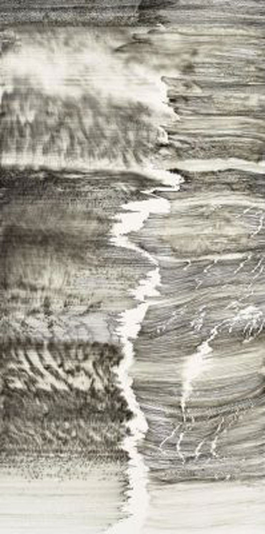 在创作过程当中,两位艺术家在同一张宣纸上同时作画,展开一场持续的视觉对话——熊辉用铁尺画出一系列平行直线,行中无数墨点记录行笔的顿挫;而韦邦雨则徒手绘制洒脱柔和的连贯曲线,汇聚成翻涌澎湃的波浪。两种线条仿佛两股变幻无穷的力量在纸上进行博弈:时而相和,时而相抗;时而互不干扰,自成一格,时而相互纠缠,重叠交织出令人意想不到的形态。