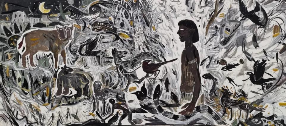 在李继的画中,依稀能看见万年前洞窟岩画的影子,那种人类童年时期的粗犷原始、奔放自由,和对自然的崇拜想象在他的画中得到了再现。李继并不将《山海经》中的每一个形象循规蹈矩的描摹,而是将自由想象与现代寓意相融合,使画面具有现代隐喻的同时大大增强了画面的观赏性和可读性,画面丰富而不杂乱,每一条线索都引人入胜,上古遗韵在观众眼前缓缓铺开,完美的契合了《山海经》作为古今语怪之祖的地位。