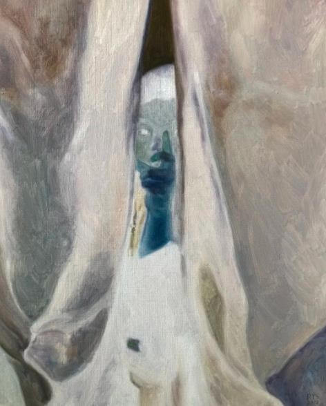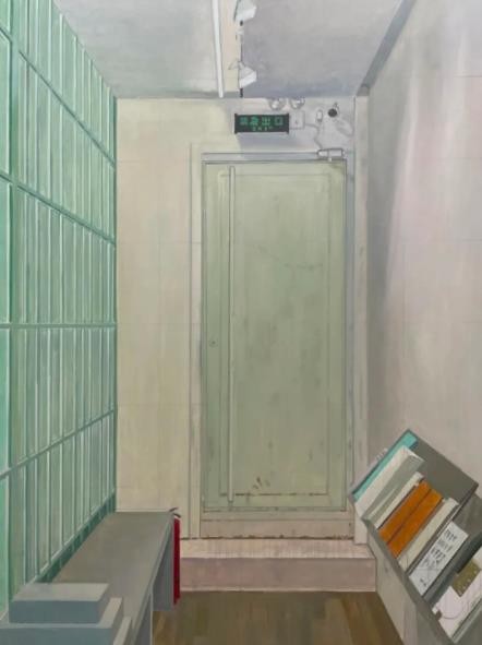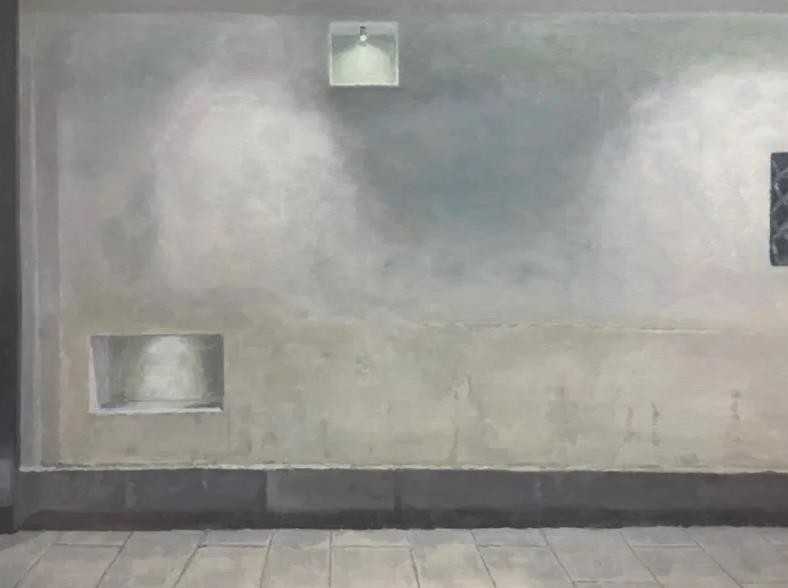 但阿利卡的影响并没有持续太久,2019年的《局部1》《局部2》所运用的已经是典型的图伊曼斯风格。这种风格变迁的根源,应该是阿利卡式的抒情方式已经无法满足他更复杂的内在体验——在他以娴熟的阿利卡风格完成的《无题》中可以看到内在的裂变:阿利卡式的深情笔调与激烈、恶毒的挑衅姿态之间有很明显的撕裂感——而借助于图伊曼斯对视觉图像不动声色的陌生化、诡异化的处理方式,以及将深沉的社会焦虑与紧张的心灵冲突隐含于淡漠、理性的油画笔调,从2019年起直到2022年,彭育松创作了一批超越个人的日常经验、体现了更敏锐的社会批判意识和更幽邃的内心感触的作品。对彭育松而言,从阿利卡风格转向图伊曼斯风格,显然意味着他对当代社会精神图景更深入的理解和更深层次的对话。