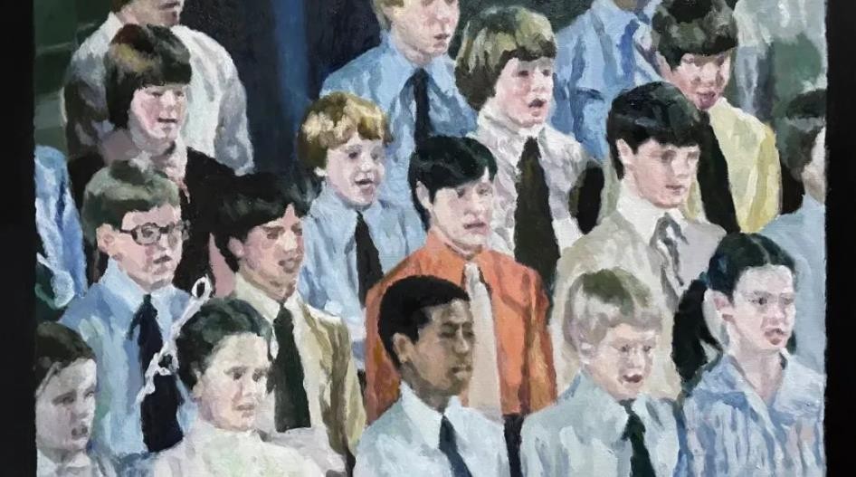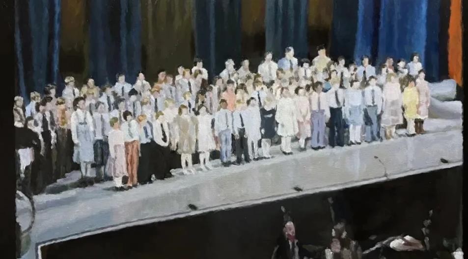 这让我想起彭育松的《天籁》和《大合唱》:《天籁》以潦草、率意的笔法塑造了一群合唱中的神态各异的孩子,寥寥数笔,不仅每个孩子的情态异常生动,很多孩子的面孔中都能体会到一种“三岁看老”般的超越年龄的深沉命相。《大合唱》的人物塑造更简单,不大的画面上挤满百十来号人,每个人物都只能是以简练的笔法勾画的草草剪影。然而,不仅每个人物都各具情态、生趣盎然,整个人群也显得错落有致、浑然成趣。在这里,真正打动人的不是图伊曼斯式的社会视角,而是对人性的深刻理解与极富灵性的表现——这些才是我在彭育松作品中感受到的最令人震惊的东西。