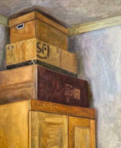 最早对彭育松有“体系性”影响的是阿利卡。在2018年的《自画像》中,这位上世纪九十年代曾经在中国油画界风靡一时的艺术家——现在受他影响的艺术家已经微乎其微——富于韵致的游动笔触与敏感而焦灼的抒情氛围还显得灰暗而滞重,但2019年的《三个纸箱》《无题》等作品,就已经流畅、生动、韵味十足了。阿利卡之于彭育松,不仅在于对绘画语言的自觉和一种对日常景物的深情体验,更在于激发了他与世界的精神对话的最初激情:没有这种激情,年轻艺术家很难走出大师们的语言迷宫进而建构自己的艺术逻辑。