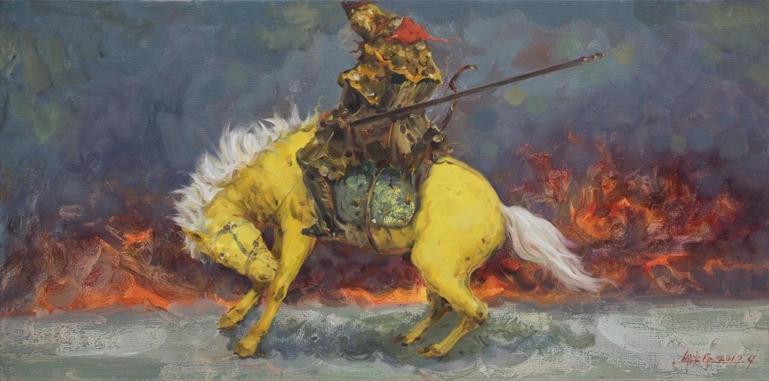 Since his series "The Allegory of the Horse" appeared in 2006, we see that the horses in his painting, no matter whether heroically flying on the battlefield or braying with frightened eyes in terror or defeat, are all brutal and wild. Qiu Guangping often uses a dramatic close-up perspective to exaggerate the facial expressions of the animal. The grimacing and neighing horses seem to be struggling in a desperate predicament. Through these personified images of horses, Qiu Guangping reveals the tragedy, pain, and destiny of life. His main tone in such paintings is sadly beautiful, full of a strong, tragic color, which possibly conveys his own understanding of the reality people have to face. Facing reality, none of the horses (or human beings), as individuals, could escape the sweeping forces of history, but they still fight on and cry out, showing their heroism. In his tragic compositions, the horses seem unwilling to passively endure their fates, but are actively trying to use their final cries and struggles to escape or change their destiny. This is possibly the attitude of Qiu Guangping himself, in dealing with life and fate: in the uproar of reality we cannot be silent because our voice is small, cannot give up the struggle because the situation is difficult, we should have confidence to break through the various barriers in our lives to seek freedom and liberation, and power to control our own fate. As personified subject matter, horses here become visual symbols of a lonely fighter or contemporary knight.