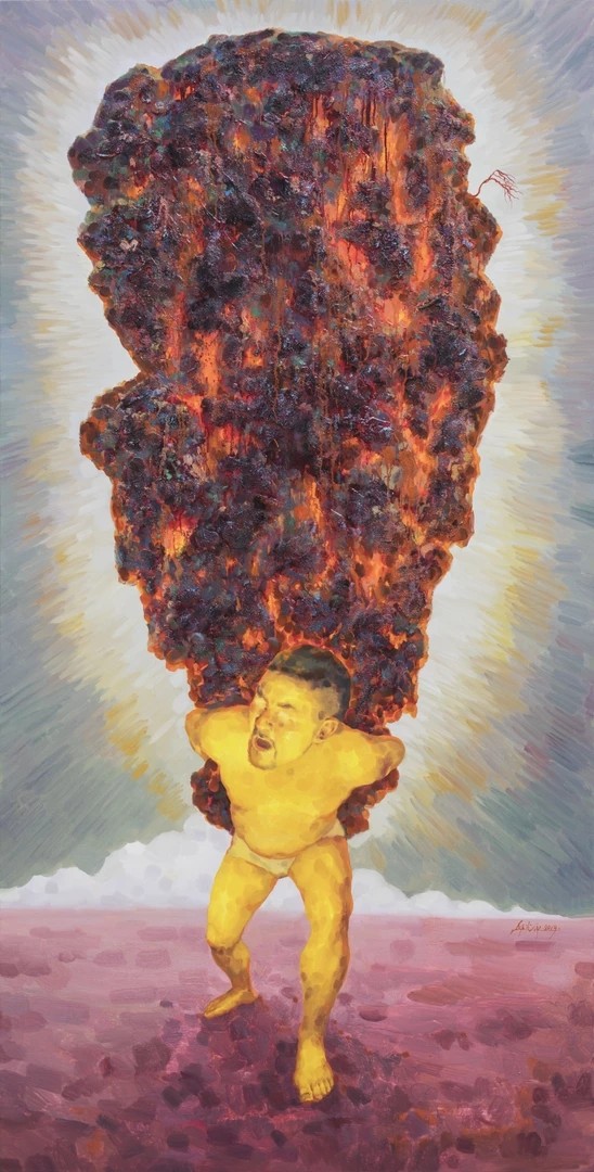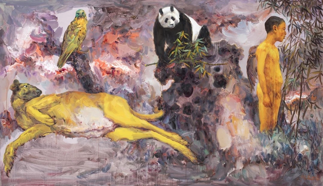 In his work Qiu Guangping creates a surreal imaginary space, his heaven or his hell. If it is heaven, this heaven is not perfectly beautiful and certainly not a paradise, because it is full of desire, greed, and violence. If it is hell, in the desolation and flames are those who still seek life and survival. With his unique approach Qiu Guangping expresses his bewilderment, anxiety, and anger as well as his deep concern for the fate of civilization and mankind. He seems to intentionally avoid the direct representation of human beings. Various animal images in his painting, such as horses, leopards, vultures and, more recently, pandas, are very striking but their meanings initially seem obscure. In his painting we can sometimes also find elements from ancient Chinese art, such as images found on tomb artifacts of mythological creatures that emerge from the flames of hell and create a ghostly scene. Such depictions of surreal and personified images are the representations of his spiritual pursuits. His painting is always executed with very strong color, and his use of pure yellow pigment especially strengthens the visual effect. The bold and dramatic compositions often possess a striking visual power.