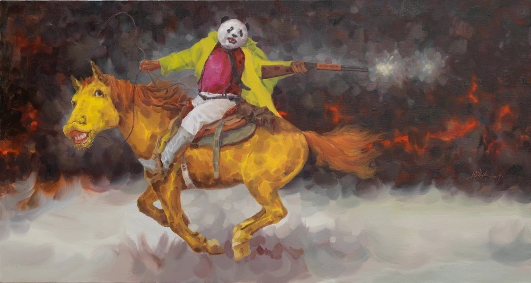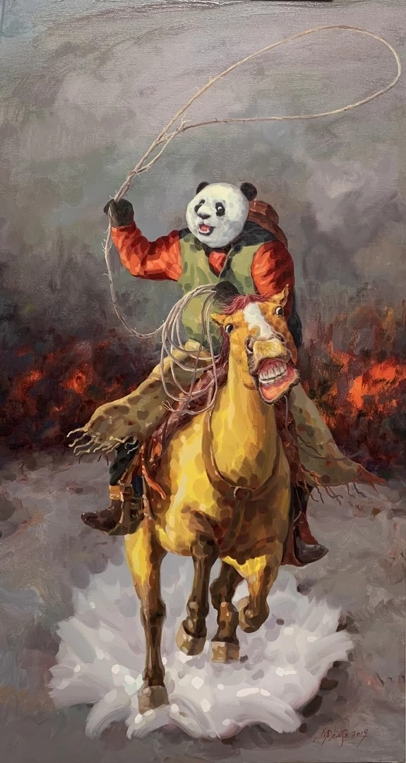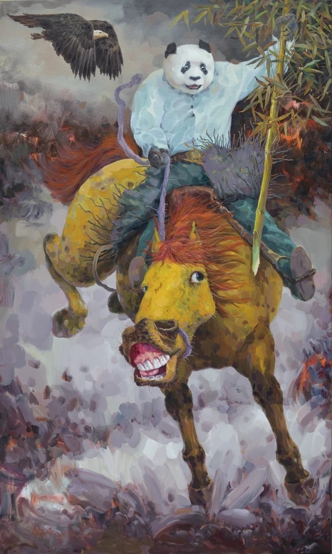 Recently, some glistening white stallions have galloped into his paintings. It seems they charge out of the fires of hell into freedom. The tragically braying horses are replaced by divine steeds freely galloping into the sunshine. The intrepid horse, now carrying a torch-bearing panda instead of a scarecrow, breaks out of hell and secular desire to approach paramita. Here, the Ode of the Horse reflects the evolution of Qiu Guangping's recent thinking. He seems to have found a free space closer to Heaven as his spiritual world.