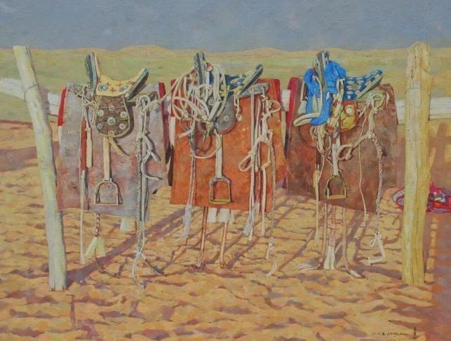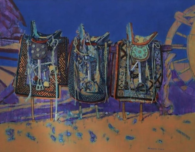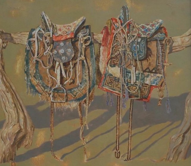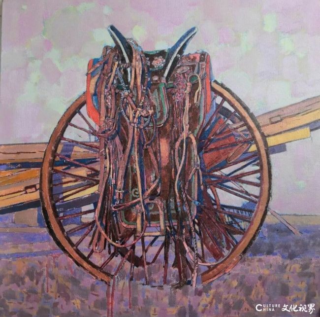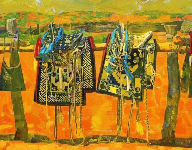他的绘画形象表现的不单纯是视觉感官的隐喻,而是符号化地记述个人的心灵世界。他从马鞍这种符号中找到了适合自己趣味的表现方式,并试图把整个游牧文化精神浓缩在这个符号里。我们在他的《故乡情》等一系列作品的笔触与轮廓相重叠,平面化与立体空间的组合强烈地感受到真正属于他自己动态思考与想象空间。画家从日常用的马鞍表现了自己对游牧文明急剧变化的复杂感情,那种无奈的心理状态又使我们联想到现代文明之下游牧文明日渐边缘与式微。这正是画家灵魂的深处思考和精神世界的折射。
