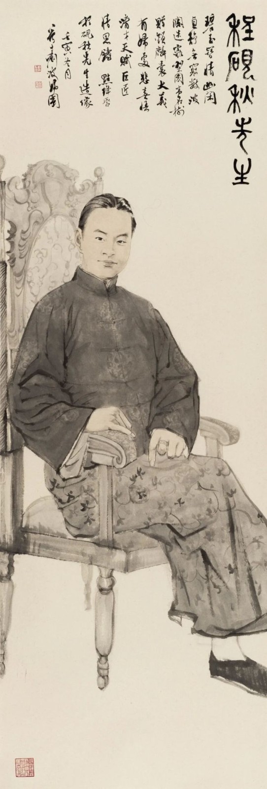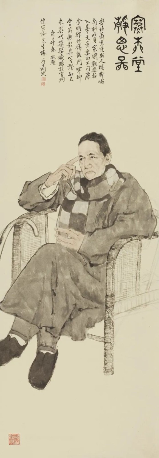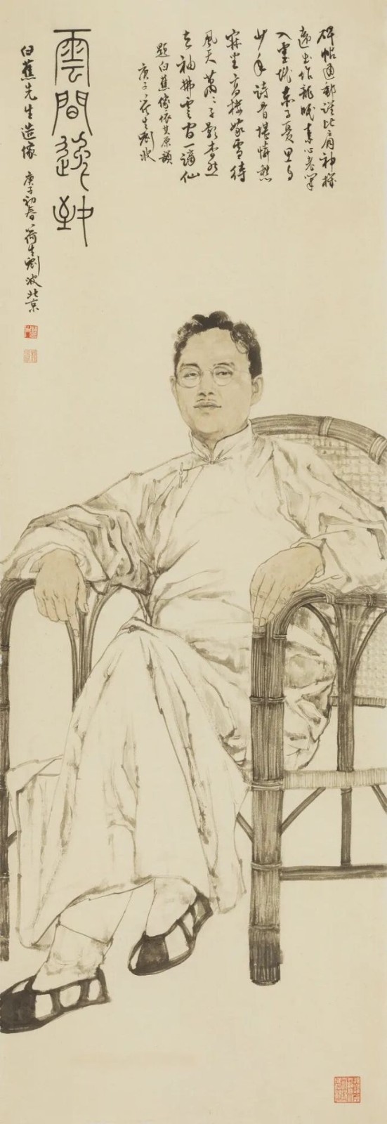 完成这部皇皇巨制,达成新的艺术高度,刘波先生跨过了诸多难关,实现了自我超越和升华。首先是心定,真正与大师巨匠们进行心灵的对话,通过探究他们的生平事迹、著作、照片,多维度揣摩人物心态,以心为画笔,准确把握人物的精气神。其二是点睛,让大师巨匠的眼睛表达他们的心声和信念。中国传统绘画讲究画人眼中的神气,顾恺之说:“传神写照,正在阿堵中”,这“阿堵”的灵光异彩也是画家在大师巨匠的精神感召下,彼此内外双照、心灵契合,搭建起与阅读者沟通的心灵之桥。其三是艺精,巧妙地融汇了院体工笔与文人写意等传统国画技法,布置简净,随形赋彩,又吸收西洋油画构图与明暗色调运用。用笔娴熟而凝重,气韵灵动而骨力老成,摄取大师巨匠们瞬间之神情意态,结体勾勒,神采毕现。尤其是面部淡墨勾写,线条与色块交相呼应,运笔一气呵成。其四是重素,只画人物,去除一切环境背景、职业道具和附加装饰,突出人物神情、做派、气度和身姿,实践了孔子所言“绘事后素”,即先得有洁白的绢面,才能绘出画面,其衍生之意在于人之美质为先,是绘事之先决条件,纹饰和技法是为本质而增色的。其五是意赅,继承了中国古代人物画像题赞的传统,使用七律、七绝、长歌、长短句和散曲等形式,概括凝炼大师巨匠们一生成就和精神境界于大美的汉字之中,文以载道,教化人心。其中许多佳句体现出“两句三年得”、“语不惊人死不休”的殚精竭虑,更是创作者执着严谨的体现。其六是书逸,题赞笔法畅达、墨彩纷呈,所用楷、行、草、隶、篆各体结构有序、章法森严,用印精当、方寸传情,彰显着文化之魅、笔墨之韵和书法之雅,可与画、赞并称“三绝”。这部画卷创作过程中,刘波先生以如椽巨笔,在艺术之路上斩关夺隘,探索创新,腕力可举鼎,楮墨颇达意,笔中有春秋!