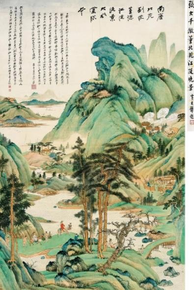 张大千早年注重临摹,擅长山水、人物、花鸟各种题材,被徐悲鸿誉为“五百年来一大千”,后来长期旅居海外,视野开阔,最终将古今画法熔为一炉,借鉴并发扬中国画传统中的泼墨法,独创泼彩大写意山水画,闻名世界,与当时西方流行的抽象表现主义相较衡。