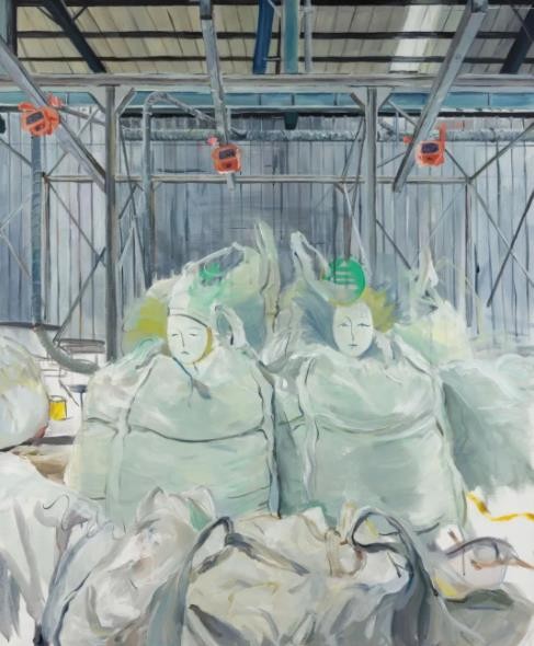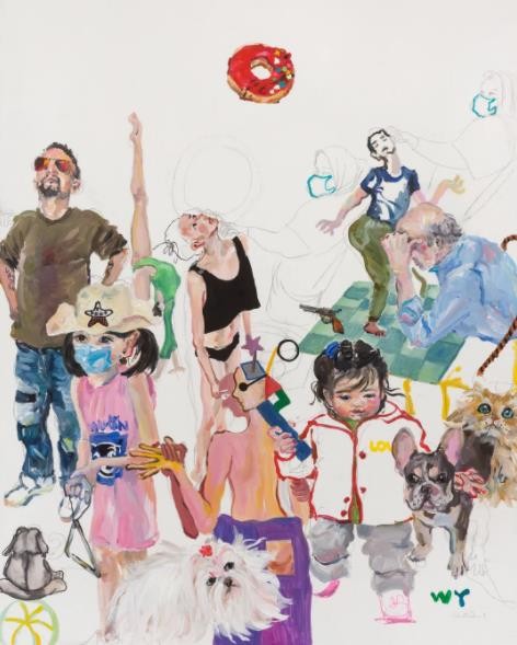 王悠画里的人物多来自现实生活,她在日常的观察中寻找灵感,为一张张熟悉或陌生的面孔编织迷人的故事,也将抓拍的照片剥离原有语境,拉入到自己所创造的视觉空间。在三幅系列作品《所有人都为甜甜圈而来》中,创作的出发点便来自一次前往朋友介绍的面包店的经历,在一边吃着高糖的甜甜圈一边观察面包店排队的顾客时,王悠觉得,这样一种对孩子来说太过幼稚却对成年人而言刚刚好的甜品,或也成为了对甜蜜生活和苦涩人生的写照,通过系列的创作,她希望用绘画的方式在负重的现实里开一场轻松的玩笑,也让甜甜圈的热量在苦咖啡中得到中和。有意思的是,在之前那部热闹的新片《瞬息全宇宙》中,多元的宇宙、人生的意义正坍塌为一个甜甜圈的形状(实际是个“贝果”),它如巨大的黑洞般吞噬一切,又尽情地展示着自己轻盈顽皮的姿态,王悠作画的初衷,抑或人生的永恒轮回、艺术的荒诞功用,似乎就在甜甜圈无休止的转动中不断发生。