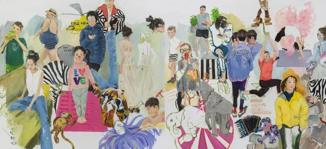 在近作《十一种孤独》中,我们看到,由两幅画布所组成的更大体量,明确地延续着王悠的这一方法,在此,画面的人物形象更加复杂丰富,王悠也更为娴熟地在每一个孤独自处的人物缝隙里,勾连起隐藏在背后、出人意料的神秘线索,使两幅画布在彼此之间构成了平行的世界、实现着奇异的呼应,或者可以说,图像的关系在此扩展至画作的关系,单一的形象也交错为复合的有机整体;而面对同样大片的留白,作品似乎也向观众发出了准入的邀请,邀请我们参与到剧本的写作与交流讨论,与艺术家一起为“十一种孤独”增添一丝温暖和默契,王悠的绘画,这种为当下疏离的社会关系舒缓气氛的轻巧努力,甚至同时做到了合乎时宜与不负责任。