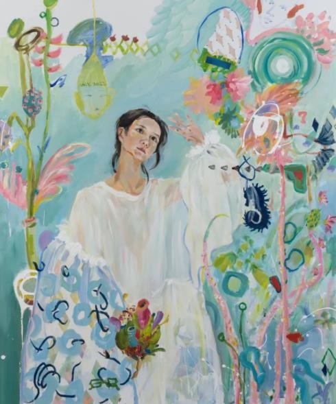 在观察他人的同时,王悠的作品中也时常出现自己的形象,但是,与一种自我表达、关注个体的创作追求不同,王悠自己如她《十一种孤独》《所有人都为甜甜圈而来》等作品中的人物形象一样,始终保持着一种近乎零度的疏远与独立,在那里,王悠的多个自己均被非自然的色彩与不真实的植物包围,她将个体的身份与主观的情绪尽力缩减,以此再度凸显寄托于自己身体的形象,与周遭环境和他人之间的复杂关联。显然在描绘自己时,她更加热爱的仍是绘画本身。