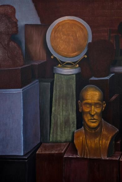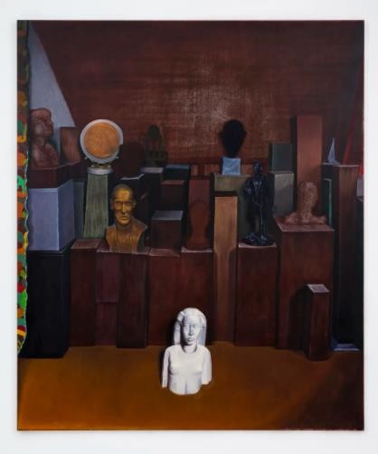 在本次展览中,最外侧两件描绘街景的作品除外,你会看到不同的室内环境。在这些室内空间里,我将一些不同的雕塑进行组构——它们是由前几代艾克曼斯们收集、囤积和创造的艺术品/装饰品,散落摆放在我家族的工作室中,如今这里也是我工作的地方。这些物件是不同作品、时段和人物的碎片。它们中的大多数已经失去了其背景和意义。