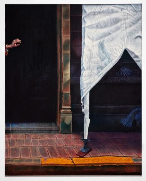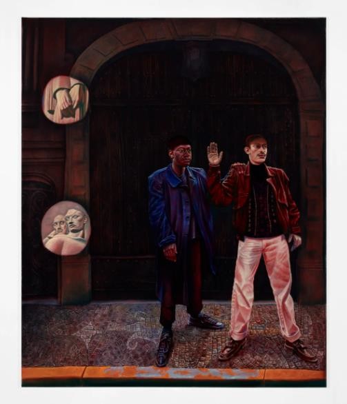 同样的,本系列也有技术层面的指涉——在《节奏》中,你看到一定程度上颜料的退化或老化将一些实体从画作中抹去。这里受到了我绝对喜欢的一幅画里克·鲍茨的《耶稣受难记》的启发,因为时间的流逝使这幅作品美丽地老化了。每次我到访布鲁塞尔时都会去皇家艺术博物馆看这幅画。本质上来看,这幅作品已严重损坏,大部分主要的颜料已经消失和退化,这导致描绘出的人物只能通过一个空洞或碎片来勾勒出一个实体。在在这些空洞中,仍然存有他们个性的残余,例如他们的鞋子或一些绘画的衣服/织物仍然存在,使其几乎成为现代主义抽象作品。