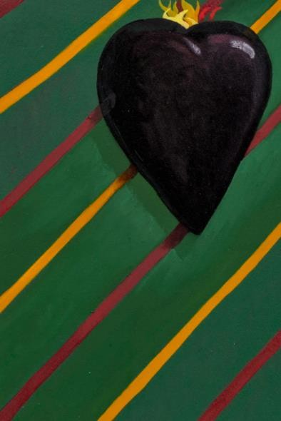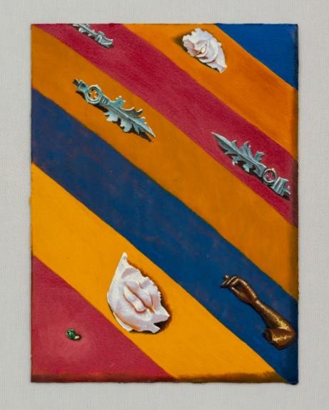 《沉思》/《装饰物与色彩配置》的创作是基于纹章家族的盾牌,描绘出他们家族的职业和某种形式的荣誉。画在《色彩配置》上的物件是我从安特卫普被拆毁的建筑中囤积的复原装饰品。我认为这将与历史保护很好地并行,而这种方式也被纳入了其他绘画的主题。