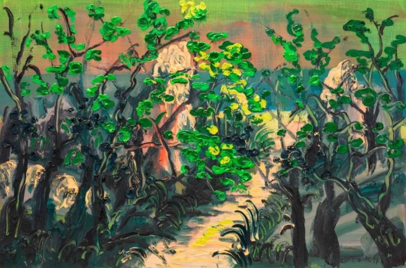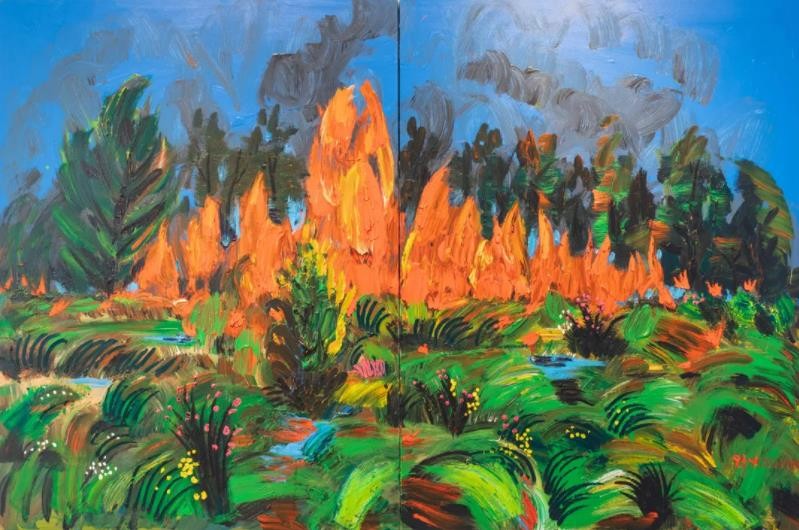 张旭东创作的风景系列作品并非单纯意义上的写生,虽然他面对的是大自然,但不是具体地描绘大自然的物态,更多的是情感上的抒发和宣泄,只不过大自然提供了一个极佳的创作场域,能够使艺术家能够快速地进入心流状态。因此,张旭东所向往的风景倾向于自我内心的演映,与大卫·霍克尼的创作初衷有相似之处。被誉为“英国艺术教父”之称的大卫·霍克尼创作了大量的风景作品,而且他认为:“过时的不是风景,而是你观看自然的方式,你的绘画方式。”大卫·霍克尼在绘画情境中找到了一条通向实现自我的路径,“你的目的地是那里的时候才会去那里,因此,在这里我能完全无干扰地画画。”其实他创作时追求的就是一种心流状态,一种本真的自我价值认定。