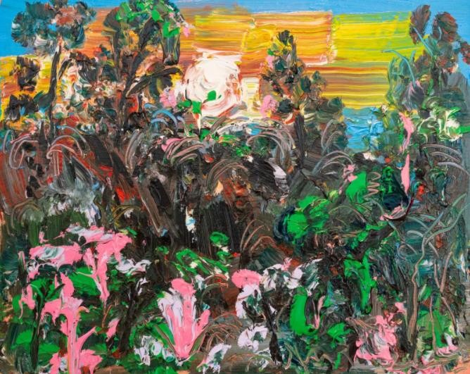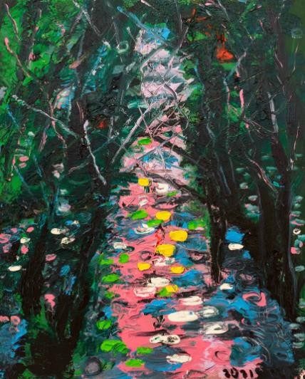 虽然,张旭东与大卫·霍克尼地创作技巧不同,但是所追求的生命状态和心理感知可以说是殊途同归。风景在张旭东色彩奔放、笔触肆意的概括下,已经超越了物象具体的或原本的视觉魅力,艺术家将现实中的物象解构之后,在极其专注的心流状态下,快速重构出一种印象派式的画面,色彩与线条的不同组合也就构成一件件色彩斑斓、形式各异的风景作品。在我们观看风景作品时,画面所带给观者的景感是非常重要的,作品的笔触、肌理、色彩、构图等多种因素共同构成了画面的景感。这种景感会在我们脑海中留下印迹,虚幻而又真实。