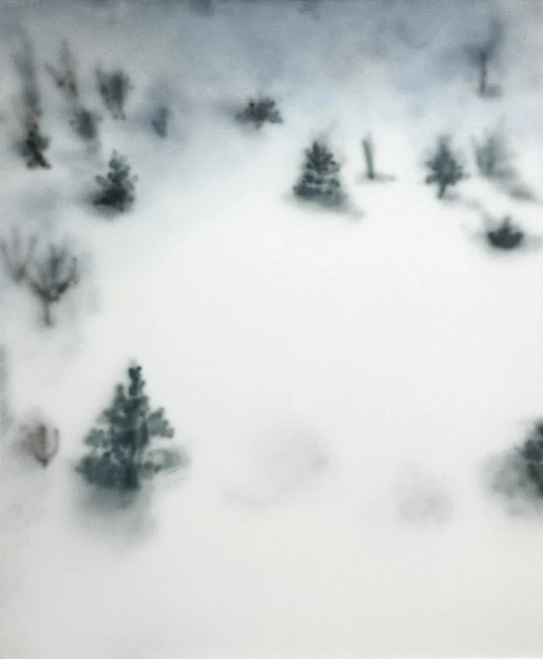 在顾文璟的《雪》系列里,雪景/人被置入到一种神秘的实存感知之中。这神秘之所以神秘来自每个人对自我记忆的探索、留驻与怀疑。在我个人的经验中,我未曾也未能精准确认过往记忆的全部细节,只残留一个未明而深刻的印象。而且事物在回忆中愈是残存,更是能显示其分明的真实,若要执意冷静地回到实地去翔实考据时,更只感其是为虚幻,是错觉,深感无趣。《雪》便将这记忆里的实存感知进行了强化,借由摄影媒介的中转,绘画既转瞬又稳固地抓取着“雪”这一回忆形式的每一段本质。回忆的价值恰恰在此:物仅仅是作为那个时候的主体经验的纯化储存而存在。回忆与时间的流动在其绘画中成为了集中鲜明的实存显现。