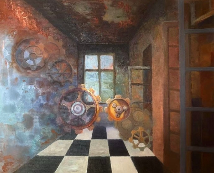 “自我”并非自私,或是“生命可能性”的创造;“构成”意味着过程,也暗含个体由“自我”与“公共”部分共同构成。能在多大程度或者能否在某些重大时刻实现“自我”,值得普遍的思考!“自我”也“像尼采所说,是有充分的`艺术家`的、跨出知识和权力的方法!” 艺术家,在社会人群中,几乎成为“自我”或“另类”的象征。作为艺术类的研究生,构成“自我”不论从社会学和专业来讲,应该是一个首要思考的课题和践行的方向,从艺术主题和表现语言上需不断的思考和打磨,逐渐构成“自我”!这是上师大美术学院油画 MFA,我工作室的艺术理念! 本次邀请参展的大部分是我的研究生,也有其他导师的学生,其他学校的部分研究生!这些展出的作品也许没有一件像是为了迎合公众的预期去创造、展示的一个产品。而是“从无法预料、无法识别、无法接受的东西之中生产出来的。”它们唤起的情感,也许不仅仅是美,而是某种不可表达性的或是执拗的见证。 周予涵作品用大量的与命运相关联的素材,如锁链、筹码、扑克牌、骰子、齿轮、怀表等元素,借用超现实主义的手法,来回应“命运”这个话题,如他所说“虽然我们不常提起,但在现实生活中,我们每个人其实都必须要不断地做选择,然而,选择是否能决定命运,这是一个有深度的哲学问题。”汤皓杰的作品中,微型人偶在虚实裂隙间演绎着存在困境的永恒轮回,在几何解构中生长出多维隐喻场域——这是用色块棱镜折射的哲学剧场。黎向明的成长三部曲《鸢尾的心事》、《那醉人的绿 吻着孤独的灵魂》、《菠萝人爱吃菠萝》是关于她自己对青春的理解,并把这几年“最美丽的精神状态”留在画布上。 刘静文的作品中试图通过记忆与想象的交织,构建一个充满情感温度的室内空间,作品是她感知生活时真实的精神图景。历乐乐作品就像是承载着她回忆的精神避难所,回忆在她画笔下重新显现,完成一幅作品的过程像放慢脚步在回忆里重走了一遍。陈依楠作品以"痕迹"为脉络,不预设终点,任由偶然的色彩碰撞在画布上自然蔓延——反复涂抹的颜料层、若隐若现的底色、不断修正的轮廓线,这些物质痕迹都成为可视化的冥想轨迹。 单文靖作品中,光影是其作品的核心,传达一种静止和存在感,引发观者的冥想,仿佛是一场关于时间感知与私人记忆的记录。王朝泽作品描绘的是他最熟悉,同样也是最怀念的城市全景或是一个街道,画面上记录着岁月的痕迹,也记录了他对表现力的理解——那些看似破败的细节里,往往藏着最动人的故事和最真实的存在。方瑞的作品《蔓草》,少女闭着眼,睫毛轻轻地颤动,像是在与风对话——“那一天风好大,大到我以为自己能生出翅膀,大到我以为能触摸到自由。” 这些作品不再是指向外部或再现什么,而是试着进行令人惊异的、陌生的、令人震撼的组合。通过自由联想,在感觉中,在记忆里,色彩与形象自动地降临和延续,它与另一个单元联系在一起,没有推理、没有论证、而是感觉的行走。作品像是逐渐接近一个有关某事物的场景,这个场景与过去有关,但它是新的,它把流逝的时间的元素记录下来,但并不提供任何对过去的认识,关于过去的事情就在这里,它不是作为一个客体而是作为一种灵晕在场。当然视觉经验总是受制于语言表达,我们需要直面原作。 这次展览对于很多位学生都是第一次,第一次把自己从学校温暖的港口里,抛向了汪洋大海,是启航,是构成“自我”路途中的第一步… 吕洪樑2025.4.28