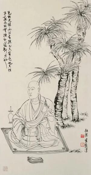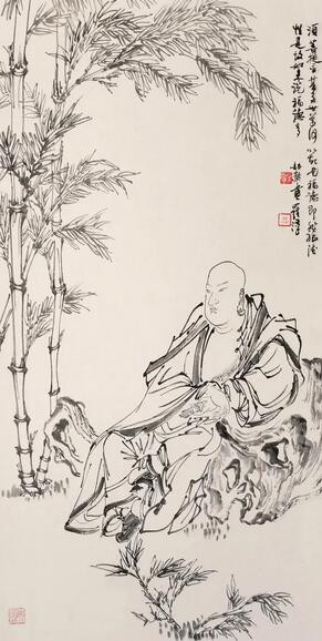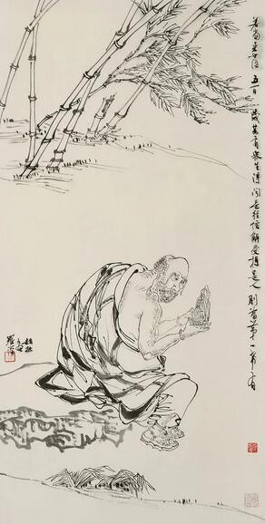 细细地看、细细地读他的这些作品,让我很有感触,因为这种感触更多的是觉得与他的作品在交流的时候,更多是一个有文心、有文才、有境界的一个学人在进行交流,而这种交流我觉得能使我更深入地读懂他的一些作品。不是说赫赫是一个复古的人,而他是一个乐古道今的人,乐古道今在赫赫画的古代题材系列当中,体现为文心是能够让人感受到他对古人的一种了解,对先贤文化的一种体验,尤其是他在造型、笔法、墨法、图式过程当中,更多他把这些构成画面的元素,都与文化融在了一起。这些虽然是一种方式、方法,但这些里面就含有非常深邃的文化的人文意识,而这种人文意识是赫赫经过十几年的修为、修炼,把一个造型从一个看似外形像是罗汉或高士的造型,经过十几年的修炼,不断地向纵深推进,使形象生发了一种深邃的人文古意。