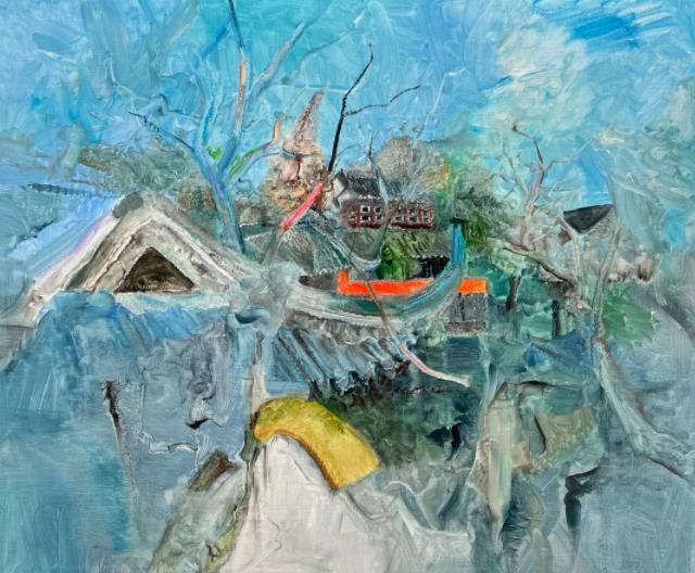 如果你对苏州园林足够熟悉,张新权作品中的许多局部细节其实都是可辨识的,里面的山水树屋其实都充满了奇特的视觉典故:这里是耦园的吾爱亭,那里是拙政园的水廊,这里是留园的清风池馆,那里是网师园的千年古柏……有时他会从全景中截取一角,有时又会对不同元素重新组合,他以清新灵动的手法调度着个人化的视觉语言,讲述着一个当代画家眼中的古典园林故事。在园林题材之外,他还选取了一些水乡市井、枕河人家的内容,铺陈渲染出私家庭院墙外洋溢着人间烟火气的生活氛围,与“虽由人作,宛自天开”的墙内景色形成有机的呼应,让观看者能够更深入地体会姑苏旧城的别样况味。除却本次展览中没有明确命名的大量园林题材之外,巨幅新作《兮》描绘了虎丘云岩寺塔的安宁与壮美,在宽银幕电影般的构图里呈示出寥廓悠远的怀古之情。