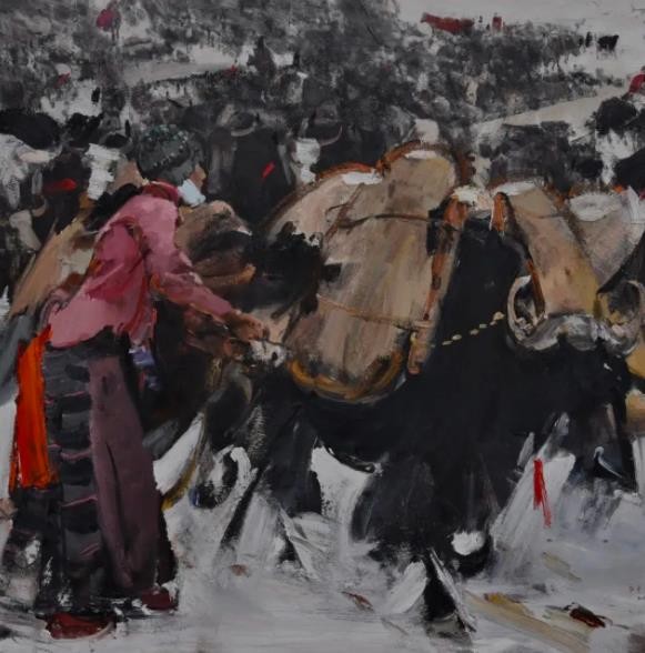 几位艺术家多年来坚持在藏区进行现场体验性创作,这种真切的源自社会现场的积累使他们对精神性的把控愈加敏锐,这次的新作,是继承,亦是突破。他们画画始终洋溢着兴奋,各自的才华在表达释放中赋予了野性与激情。看到如今仍有这样富有创造激情的艺术家深感激动。写生的目的并不是图像记录,艺术家来来往往,用他们的艺术作品留下自己眼中的甘南,这是一种“记忆”,被赋予了个性色彩的表现力“记忆”。他们的作品对于甘南完完全全的现场性的描述不旨在表现风土人情,画面中的人物,景物都是作为艺术家热爱生命与自然的情感意化。他们在绘画语言上都流露出各自的真性情,但看得出,他们都尽可能捕捉当地藏民身上的勤劳、纯朴、善良、谦卑、充满神圣感的精神特征,捕捉真实。真实是一种强悍可信的表现力,真实不是指物理层面的真实,而是心理的真实感受和情感的真实。反观现在有些作品只是满足社会现象的客观描写,缺乏个人心里感受的悸动,作品很难打动人。看到几位年轻人对待绘画,对待艺术的真诚,甚感欣慰。