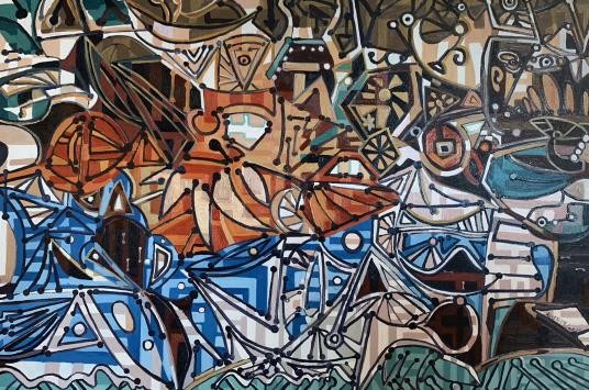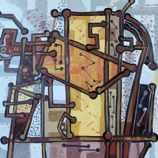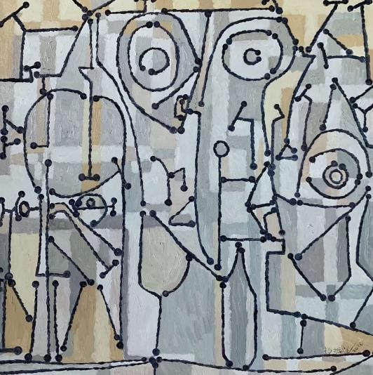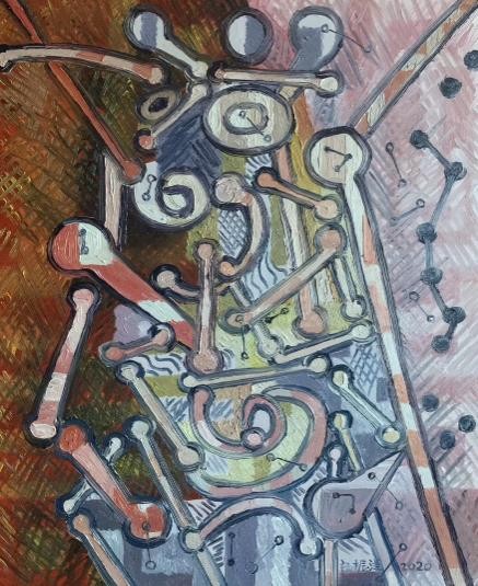 有意思的是,在杨振洋分割画面的形状时,运用了许多形似骨头的符号。它们犹如一根根钢铁支架,在他的精心布置下,成为画面的主体结构,不仅使他的绘画获得了内在的力量感和运动感,同时,也将他试图建构外部和谐社会的观念呈现了出来。