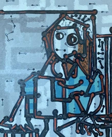 杨振洋的绘画吸收了立体主义的表现方式,同时,也呈现了当今信息时代支离破碎的社会特征。在他的绘画中,人与物都被一一分解,然后,再重新组合成一些近乎抽象的视觉符号,再辅之以细腻的笔触,绚烂的颜色,从而形成了一种极具装饰意味的画面。