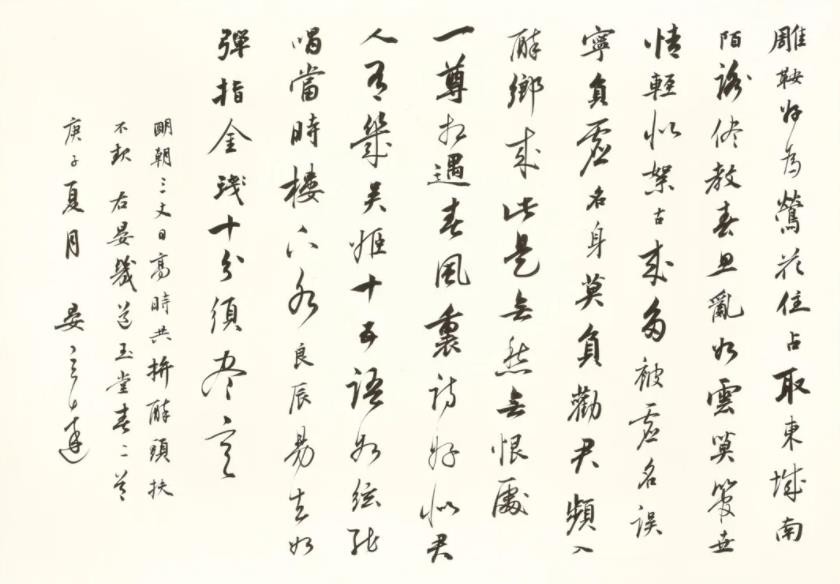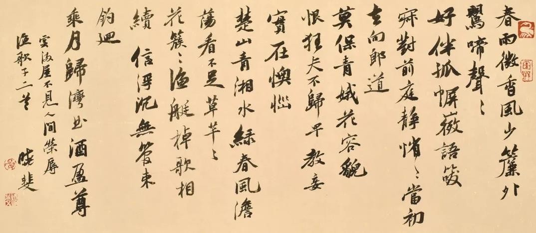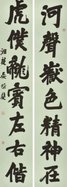 晏晓斐的书法风格偏向于庙堂气。他的书法无论幅式大小都很注重细节,首先追求点画结体的准确,用笔的入行收转,空间结构开合,一招一式,从不苟且。同时也追求整体面貌的趣味与和谐,在粗细长短、大小正侧、浓淡枯涩、疏密虚实的对比中表现美的空间,表现内心世界。
