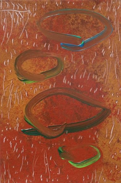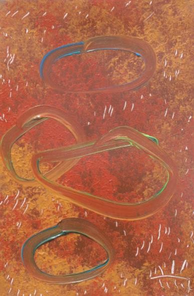 某种意义上,子晴乙木的创作可看作一种无意识的自动书写与意象联想主义的抽象化表达,他始终保持一种似幼稚的天真自由的抽象状态。画面上大量出现以卷曲线、涂划线为主的笔触丛集,这些笔触丛集有时候是一种心理笔迹,仅反映一种振颤性的无意识的手动状态;有时又是一种抽象笔触的形状辨识不清的意象,或者像一个浮游空中的生物,或者出于某种日常情景的抽象化;有时又像一种原始的或者现代涂鸦的个人图记,就像罗兰·巴特意义上的欲望记号。