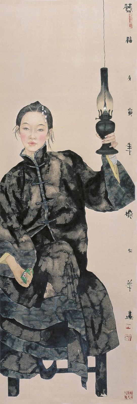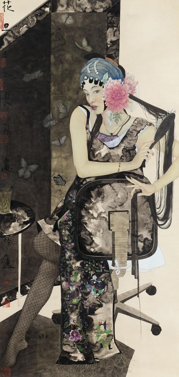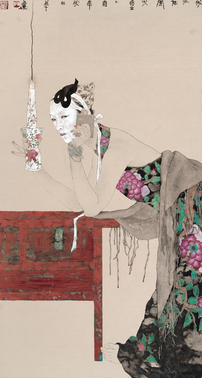 她总是在画面上寻找或制造一种反差,除了时尚元素与古旧物件碰撞所生成的隐喻、简约外形与写真图像所构成的冲突,她也力图探寻与创造绘画语言上的对比。譬如,细微刻画的脸部手部与放松写意的衣着服饰,厚敷剥落的色料与轻快透明的墨色,沉着古雅的色彩与细劲有力的勾线,如此等等。她力图在这些语言的互冲之中形成画面的统一性。她擅长墨色的运用,尤其喜爱通过以水撞墨的方式构成画面的主体结构,其人物服饰、屏风边框、烛台油灯等,莫不通过这种大面积的没骨式的墨块形成画面主视觉,而以水撞墨的即兴随意、墨与水幻化的不确定性,也无疑呈现了水墨画所独有的快意与洒脱。